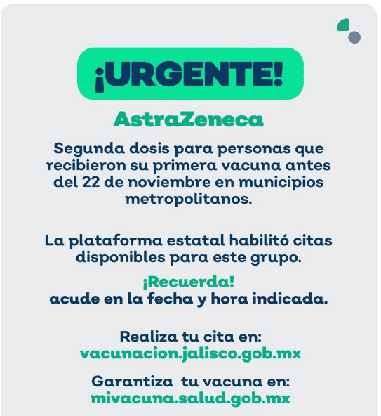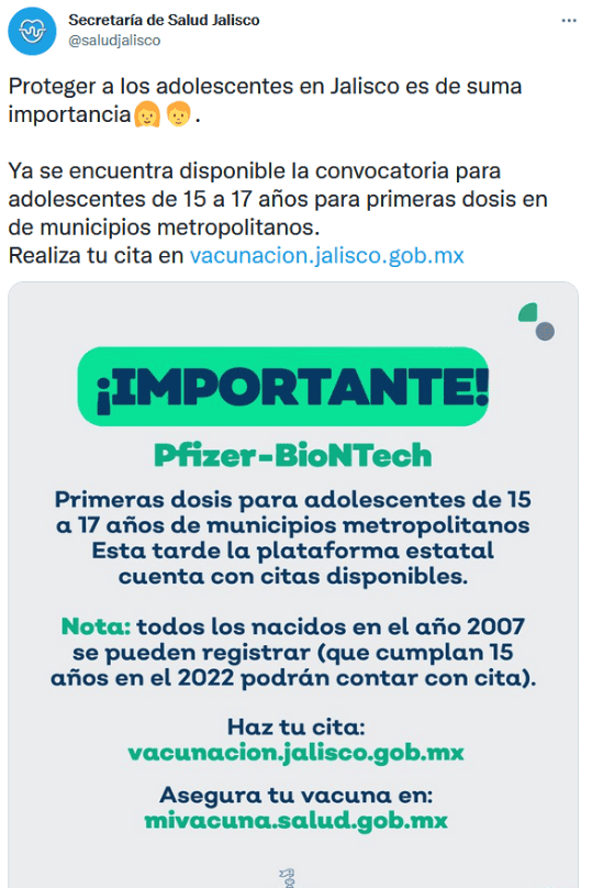 La tarde de este miércoles, la Secretaría de Salud Jalisco (SSJ) informó que abrió una nueva convocatoria para aplicar la primera dosis de la vacuna contra al COVID a adolescentes de 15 a 17 años.Si eres de este grupo de edad, y además vives en alguno de los municipios de la Zona Metropolitana de Guadalajara (ZMG) como Tonalá, Tlaquepaque, Zapopan, Tlajomulco, El Salto o Guadalajara, debes registrarte en la página estatal vacunacion.jalisco.gob.mx."Proteger a los adolescentes en Jalisco es de suma importancia. Ya se encuentra disponible la convocatoria para adolescentes de 15 a 17 años para primeras dosis en de municipios metropolitanos", escribió la dependencia en sus redes sociales. El 19 de noviembre de 2021 se abrió por primera vez el registro estatal para este grupo de edad en Jalisco.Es importante destacar que todos los adolescentes que cumplan 15 años este 2022 podrán agendar su cita para recibir su vacuna contra el COVID, de la farmacéutica Pfizer.La SSJ también habilitó el registro de citas para la segunda dosis de la vacuna contra el COVID del laboratorio AstraZeneca a quienes se inmunizaron por primera vez antes del 22 de noviembre en la ZMG. Se requiere ingresar CURP.Para más información sobre las jornadas de vacunación vigentes en Jalisco, consulta: https://coronavirus.jalisco.gob.mx/ruta-de-la-vacunacion/Para dudas sobre el registro y vacunación:Puedes llamar de lunes a domingo, de 8:00 de la mañana a 8:00 de la noche, al call center 33 38 23 32 20.GC