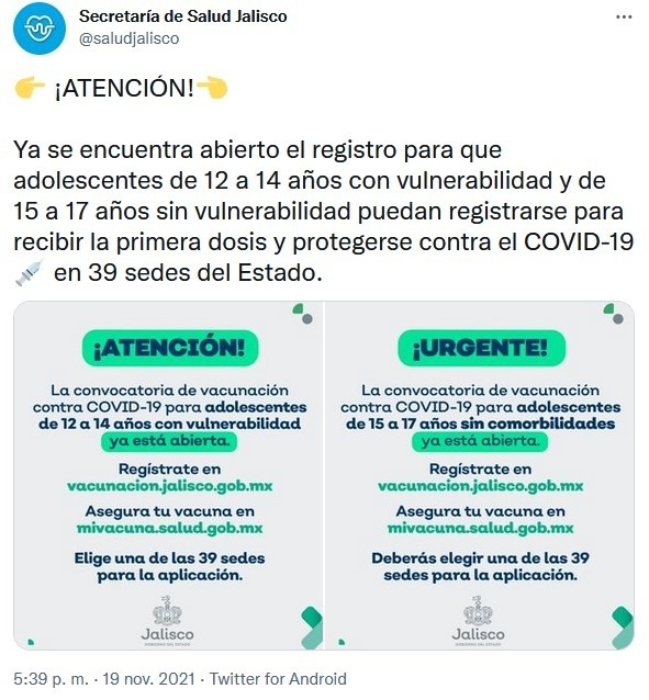 La Secretaría de Salud Jalisco abrió esta tarde el registro para las primeras jornadas de vacunación anti COVID-19 en el estado para menores de 15 a 17 años sin comorbilidades o vulnerabilidad.También está ya disponible el registro para el grupo de 12 a 14 años con comorbilidades. Las vacunas anti COVID-19 para ambos grupos se aplicarán en 39 sedes de JaliscoSe requiere ingresar CURP. En el grupo de 15 a 17, se requiere tener 15 años cumplidos al 15 de enero de 2022 o más.Para más información sobre las jornadas de vacunación vigentes en Jalisco, consulta: https://coronavirus.jalisco.gob.mx/ruta-de-la-vacunacion/Para dudas sobre el registro y vacunación:Puedes llamar de lunes a domingo, de 8:00 de la mañana a 8:00 de la noche, al call center 33 38 23 32 20. IM