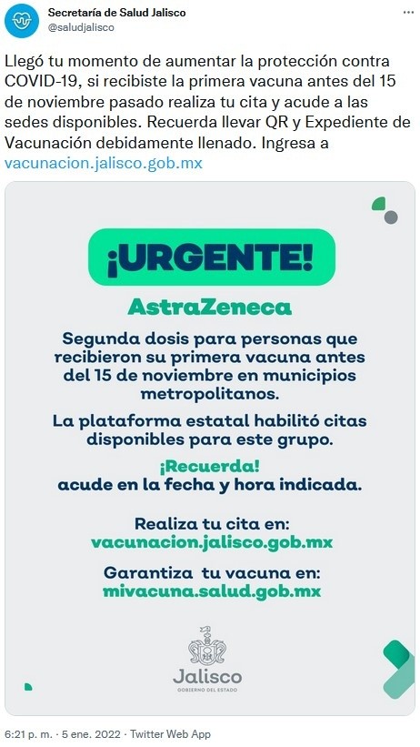La Secretaría de Salud Jalisco anunció este miércoles que abrió el registro para citas para la segunda dosis de la vacuna anti COVID-19 de AstraZeneca para personas de 18 años o más de la Zona Metropolitana de Guadalajara (ZMG), que hayan recibido la primera vacuna antes del 15 de noviembre de 2021.Debes residir en Guadalajara, Zapopan, El Salto, Tlajomulco, Tlaquepaque o Tonalá para hacer tu cita a través de la plataforma estatal: https://vacunacion.jalisco.gob.mx.IM
