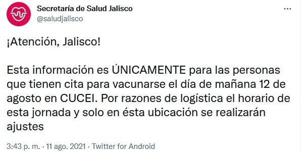 Habitantes de la Zona Metropolitana de Guadalajara que buscaban aplicarse la segunda dosis de la vacuna anti COVID-19 llegaron esta mañana al módulo de vacunación del CUCEI y se toparon con la sorpresa que habían cambiado las citas.Personas se congregaron afuera de las instalaciones del centro universitario en Guadalajara y mostraron confusión y molestia porque no se enteraron del cambio.Autoridades informaron que se le llamó a la mayoría de los citados y a otros se les envió un correo para avisarles del cambio.Ayer, la Secretaría de Salud Jalisco (SSJ) dio a conocer a través de sus redes sociales que se ajustó el horario de citas para los convocados a vacunarse este jueves 12 de agosto solo en el CUCEI (Centro Universitario de Ciencias Exactas e Ingenierías), ubicado en avenida Revolución."Esta información es ÚNICAMENTE para las personas que tienen cita para vacunarse el día de mañana 12 de agosto en CUCEI. Por razones de logística el horario de esta jornada y solo en ésta ubicación se realizarán ajustes", informó la SSJ en Twitter.Las citas entre las 7:30 y las 14:30 horas se cambiaron para este mismo jueves, pero entre las 15:00 y 19:30 horas.Las autoridades aclaron que quienes no puedan acudir hoy por la tarde, podrán presentarse los días 13, 18, 19 o 20 de agosto, en el mismo horario de su cita original, con el documento con QR que ya se les asignó.La SSJ cuenta con el teléfono 33 3823 3220 para resolver dudas al respecto con un horario de atención de 08:00 a 20:00 horas, los siete días de la semana.Si te interesó esta noticia y quieres saber más, entonces descarga y descubre INFORMAPlus, la aplicación digital de EL INFORMADOR, en donde tenemos contenidos exclusivos, seleccionados por nuestros editores, para darles una experiencia más completa a los lectores. Descarga la aplicación y pruébala GRATIS por treinta días. Para iOS: https://apple.co/35jaVgbPara Android: https://bit.ly/3gwVSEVSi eres suscriptor de EL INFORMADOR tu acceso está incluido, solicítalo al 33 3678-7777IM