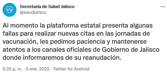 La Secretaría de Salud Jalisco (SSJ) informó esta tarde que se presentan fallas en la plataforma estatal para agendar citas de vacunación anti COVID-19."Al momento la plataforma estatal presenta algunas fallas para realizar nuevas citas en las jornadas de vacunación, les pedimos paciencia y mantenerse atentos a los canales oficiales de Gobierno de Jalisco donde informaremos de su reanudación", dijo la SSJ a través de sus redes sociales.Se trata de la plataforma vacunacion.jalisco.gob.mx, a través de la cual se ofrecen citas para dos campañas activas.El pasado 29 de diciembre, autoridades de Jalisco abrieron el registro para vacunas de refuerzo contra COVID-19 para adultos mayores de 60 años en la Zona Metropolitana de Guadalajara (ZMG), que hayan recibido la última dosis antes del 7 de julio de 2021.También se abrió el registro para la segunda dosis de adolescentes de 15 a 17 años que recibieron su primera vacuna anti COVID antes del 4 de diciembre.https://coronavirus.jalisco.gob.mx/ruta-de-la-vacunacion/En redes sociales:Twitter: https://twitter.com/saludjaliscoFacebook: https://www.facebook.com/SaludJaliscoIM