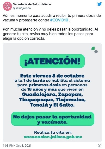 La Secretaría de Salud Jalisco abrió esta tarde de nuevo el registro para recibir la primera dosis de la vacuna anti COVID-19 a personas de 18 años y más en la Zona Metropolitana de Guadalajara (ZMG).La nueva convocatoria para vacunarse a través de citas se dirige a los mayores de edad residentes de los municipios de Guadalajara, Zapopan, Tlaquepaque, Tlajomulco, Tonalá y El Salto.En sus redes sociales, la Secretaría de Salud estatal informó que a la 1:00 PM de este viernes habilitó el registro a través de la plataforma estatal https://vacunacion.jalisco.gob.mx.Horas antes, se habilitó el registro para la segunda dosis de la vacuna contra el COVID-19 para quienes hayan recibido la de AstraZeneca a más tardar el 6 de agosto, o de Moderna, para los inmunizados hasta el 17 de septiembre.Para más información sobre las jornadas de vacunación vigentes en Jalisco, consulta: https://coronavirus.jalisco.gob.mx/ruta-de-la-vacunacion/Para dudas sobre el registro y vacunación:Puedes llamar de lunes a domingo, de 8:00 de la mañana a 8:00 de la noche, al call center 33 38 23 32 20.IM