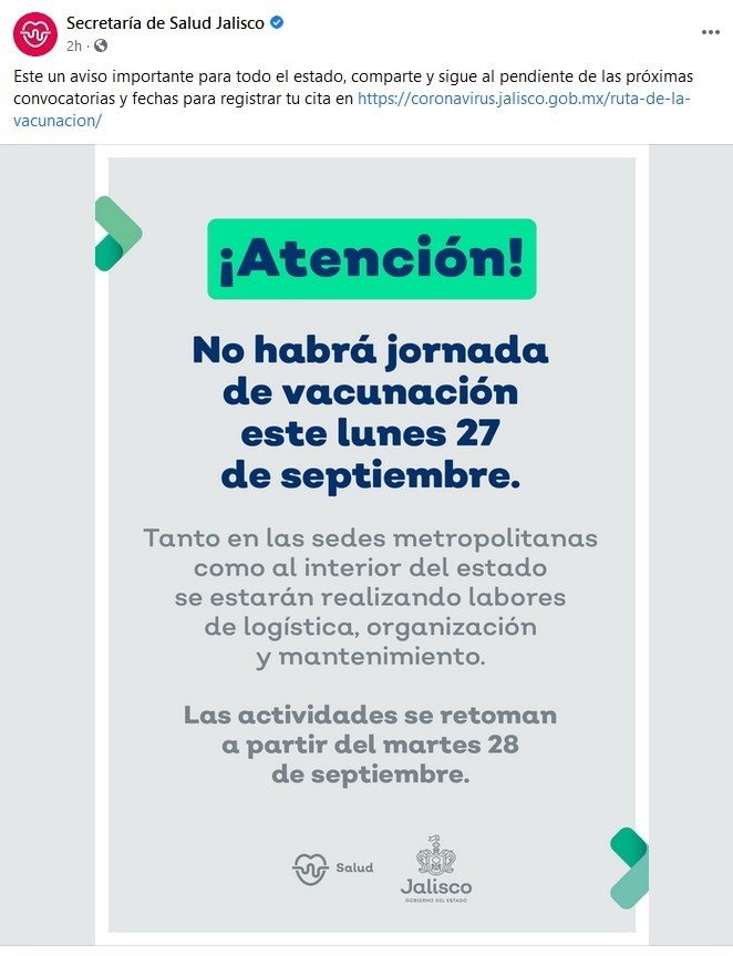 Las jornadas de vacunación anti COVID-19 se suspenderán el lunes 27 de septiembre en todo Jalisco, informó hoy la Secretaría de Salud del estado (SSJ).A través de sus redes sociales, la SSJ explicó que no se aplicarán vacunas el lunes, puesto que harán labores de logística, organización y mantenimiento en las sedes de la Zona Metropolitana de Guadalajara y del resto de Jalisco.A partir del martes 28 de septiembre se reanudará la vacunación anti COVID en donde haya jornadas vigentes.https://coronavirus.jalisco.gob.mx/ruta-de-la-vacunacion/Si te interesó esta noticia y quieres saber más, entonces descarga y descubre INFORMAPlus, la aplicación digital de EL INFORMADOR, en donde tenemos contenidos exclusivos, seleccionados por nuestros editores, para darles una experiencia más completa a los lectores. Descarga la aplicación y pruébala GRATIS por treinta días. Para iOS: https://apple.co/35jaVgbPara Android: https://bit.ly/3gwVSEVSi eres suscriptor de EL INFORMADOR tu acceso está incluido, solicítalo al 33 3678-7777IM