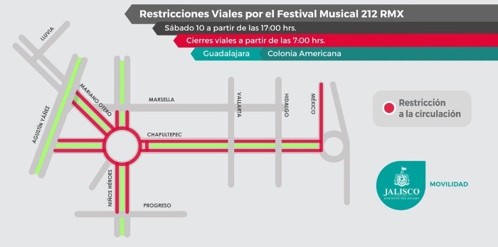 Este sábado 10 de noviembre se celebrará el Festival 212 de RMX en Av. Chapultepec, por lo que la Secretaría de Movilidad anunció un operativo especial del vialidad sobre la zona, informaron autoridades.A partir de las 07:00 horas de este sábado, las avenidas Chapultepec, Av. México, Mariano Otero hasta Agustín Yañez, Niños Héroes hasta la calle Progreso y Maestranza, serán cerradas a la vialidad para los automovilistas, por lo que se recomienda tomar vías alternas.El concierto que afectará particularmente a las vialidades de la colonia Americana, empezará a las 17:00 horas.Se espera que pasada la media noche, cuando concluya el concierto, la circulación en la zona quede abierta al paso.NM