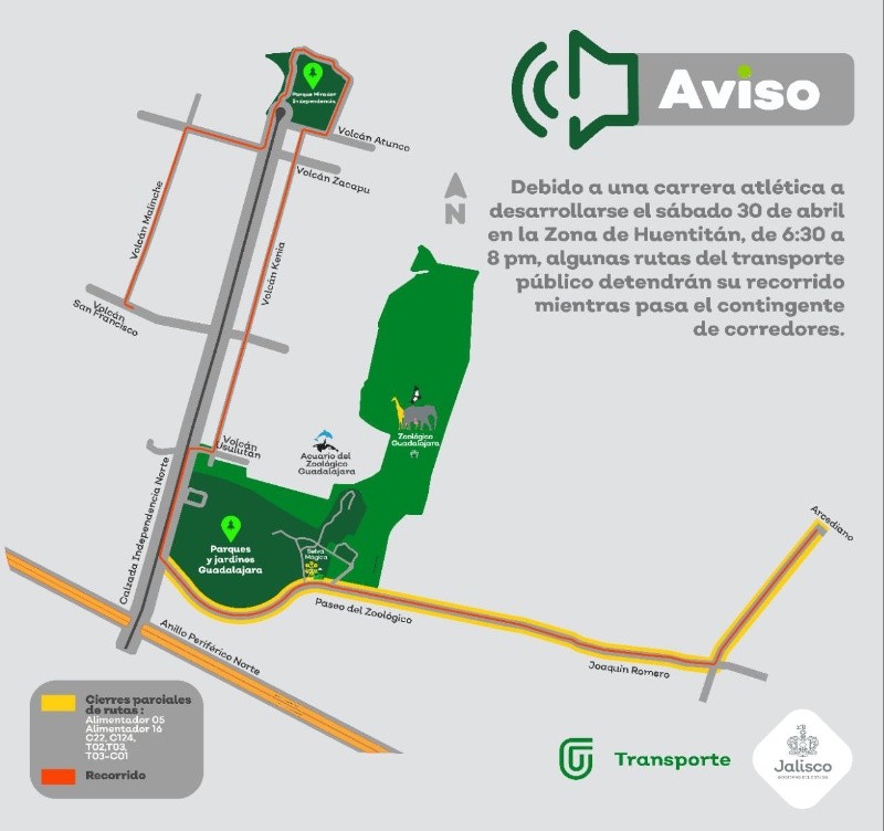 Con motivo de una carrera atlética que se desarrollará en la zona de Huentitán, en Guadalajara (en los alrededores del Zoológico de Guadalajara), la tarde de mañana sábado seis rutas del servicio público de transporte detendrán su recorrido.La competencia deportiva se realizará de las 18:30 horas a las 20:00 horas, las rutas solamente detendrán su marcha en lo que pasa el contingente de atletas.Las rutas que suspenderán su derrotero sobre la Avenida Belisario Domínguez, en el tramo comprendido entre las calles Arcediano y Joaquín Romero, son la C22, C124, T02, T03 y T03-C01.También, la alimentadora 05 detendrá su paso por la calle Joaquín Romero/Paseo del Zoológico en el tramo comprendido entre la Avenida Belisario Domínguez a Calzada Independencia.En comunicado la Secretaría de Transporte solicitó a la ciudadanía comprensión e invitó a usuarios del transporte público a tomar previsiones al respecto.