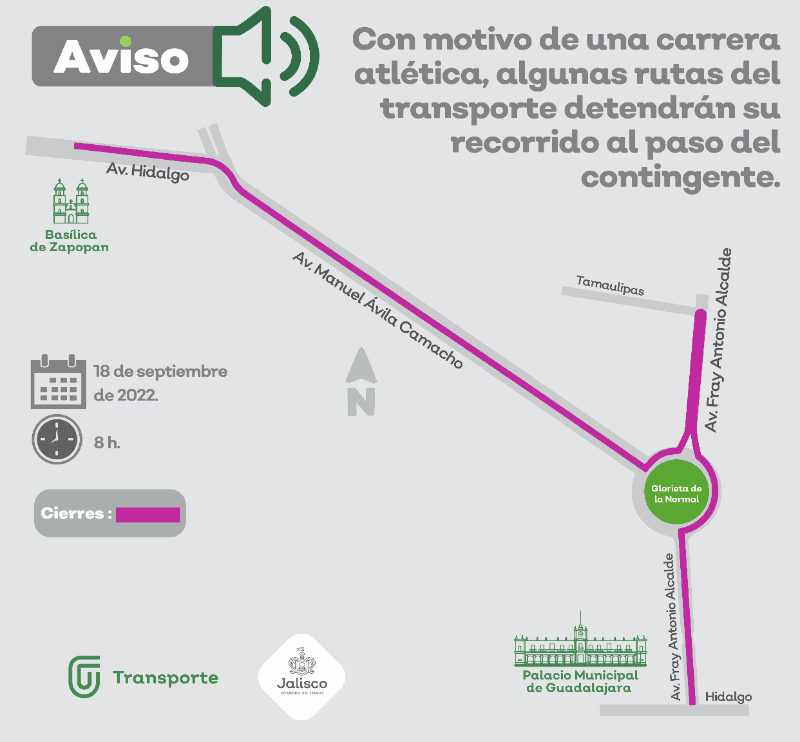 Debido a una carrera deportiva que se llevará a cabo el próximo domingo, 61 rutas del transporte público se verán afectadas por lo que tendrán que modificar su derrotero. El 18 de septiembre se realizará una competencia atlética en la zona centro de Guadalajara, a partir de las 07:00 horas, y terminará en el centro de Zapopan.Dicha competencia partirá de avenida Alcalde, justo a las afueras de la Presidencia Municipal de Guadalajara, y continuará por calle Tamaulipas, avenida Fray Antonio Alcalde, Manuel Ávila Camacho, Av. Aurelio Ortega y Av. Hidalgo frente a Palacio Municipal de Zapopan.Las rutas C16, C21, C43 Haciendas del Valle, C43 Valdepeñas, C64, C65, C69, C90, C91, C92, T14A-C02, T14A-C03, T14A-C04 dos vías, T14B-C02 dos vías, T15, T15-1, T15 Dos Templos, T15-C01, T15-C02, T15-C04, T15-C04 El Quince, T15-C04 Manantial, T15-C05, T15-C06 Dos Templos, T15-C06 Hospital Civil, T15-C06 Mesa Colorada y T16A-C01 detendrán su paso al llegar a Avenida Fray Antonio Alcalde en su sentido de sur a norte.Por su parte, las rutas C33, C79, C81, C82, C85, C88, C89, C108, C121-A, C120, C136, T07, T07-C01, T08-C01, T09, T14B, T14B-C01, T16A-C01, T16B-C03 Agujas, T16B-C04 Villas, T16B-C05 Parques-Palermo, T16B, T16B, T16B-C01 y T16B-C02 que transitan por Avenida Manuel Ávila Camacho, tendrán que detener su paso al llegar a la misma en su sentido de oriente a ponientePor último las rutas, C135, C72, C73, C84, C85, T08, T16B, T16B-C06 La Magdalena, T16B-C07 Vistas y T16B-C08 La Piedrera, se detendrán al llegar a Avenida Hidalgo.La Secretaría de Transporte pide a los ciudadanos planear con antelación sus traslados por la zona de la carrera. GC