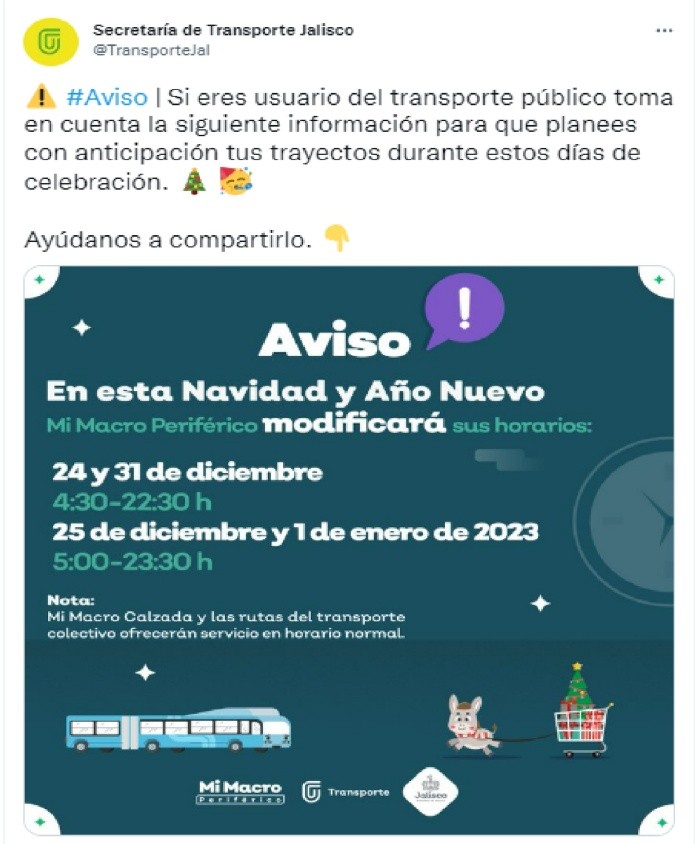 Hoy es Nochebuena, y probablemente muchas personas deberán moverse en transporte público para poder llegar a visitar a sus familias, o tendrán que utilizarlo al salir de sus trabajos para regresar a casa.Pero con ello quizá también te preguntes a qué hora dejarán de pasar hoy los camiones y el resto de sistemas del Transporte Público en la Zona Metropolitana de Gudalajara para saber si podrás llegar a tiempo o tendrás algún inconveniente, y por ello aquí te decimos cuáles serán sus horarios.Según informó la Secretaría de Transportes, los camiones no tienen autorizado terminar sus derroteros antes de lo previsto, por lo cual deberán operar en los horarios habituales conocidos por sus usuarios según las rutas y zonas.En caso de que las personas noten que alguna ruta dejó de pasar antes de tiempo puede generar sus reportes a través de las redes sociales de la Secretaría de Transportes.El único sistema que modificará su horario de operación será el Peribús, que operará hasta media hora más tarde: su servicio se extenderá hasta las 23:30 horas, aunque deberás estar en las estaciones poco antes para alcanzar a tomar tu unidad a tiempo.El resto de los sistemas, como las Líneas 1, 2 y 3 del Tren Ligero estarán en operación hasta las 23:00 horas, de la misma forma que el Macrobús en su ruta normal; su Servicio Expréss estará disponible hasta las 22:00 horas. Por último se encuentran las líneas de SiTren, cuyos horarios habituales son: L1 y L3 hasta las 23:00 horas, L1-B hasta las 21:30, L2 hasta las 23:20 horas y la L4 hasta las 22:00 horas. MF