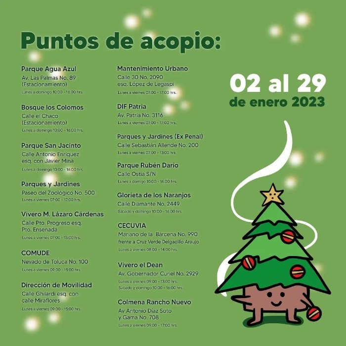 ¿Compraste un arbolito o pino natural para animar las fiestas decembrinas en tu hogar y ahora no sabes dónde tirarlo porque el camión de la basura no se lo puede llevar?No lo tires a la calle, pues además de generar contaminación por no darle el trato correcto, podrías ocasionar algún accidente.Ante esta situación, el Ayuntamiento de Guadalajara abrió 15 puntos de acopio gratuitos donde recibirán tu arbolito de Navidad natural para darle el tratamiento adecuado y una nueva vida a partir de la elaboración de composta y mulch, un material que da nutrientes a la tierra y da una vista más agradable a los camellones y parques de la ciudad.A continuación te compartimos la lista de lugares y horarios donde podrás llevar tu ejemplar, aportando un granito de arena para devolver a la tierra la felicidad que le llevó a tu familia durante el último mes:Lunes a domingo de las 10:00 a las 16:00 horas.Lunes a domingo de las 10:00 a las 16:00 horas.Lunes a domingo de las 10:00 a las 16:00 horas.Lunes a viernes de las 7:00 a las 17:00 horas.Lunes a viernes de las 7:00 13:00Lunes a viernes de las 9:00 a las 15:00 horas.Lunes a viernes de las 9:00 a las 15:00 horas.Lunes a viernes de las 7:00 a las 17:00 horas.Lunes a viernes de las 7:00 a las 17:00 horas.Lunes a viernes de las 7:00 a las 13:00 horas.Lunes a domingo de las 10:00 a las 16:00 horas.Sábado y Domingo de 10:00 a 16:00 horasLunes a viernes de las 8:00 a las 14:00 horasLunes a viernes de 9:00 a 13:00 horas y sábados y domingos de las 10:00 a las 16:00 horasLunes a viernes de las 9:00 a las 17:00 horas.Los 15 centros de acopio, hasta la última información compartida por la Dirección de Medio Ambiente del Ayuntamiento de Guadalajara, estarán en operación del 02 al 29 de enero, y no tiene ningún costo el dejar los arbolitos en estos sitios.JM