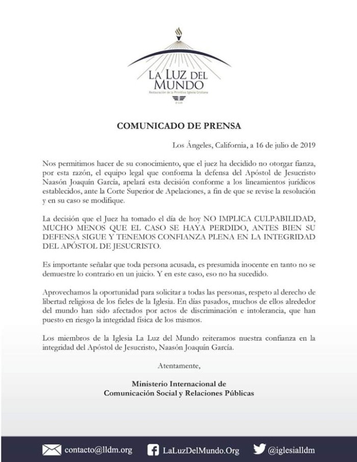 Un juez de la Corte Superior del condado de Los Ángeles negó hoy el derecho a quedar en libertad bajo fianza al líder de la iglesia de La Luz del Mundo, Naasón Joaquín García, acusado de abuso sexual, tráfico de personas y abuso infantil.Un video y una serie de descripciones sexuales implícitas en compañía de menores, localizadas en dispositivos móviles, fueron cruciales para la decisión del juez, que obligará a Joaquín a enfrentar en prisión las 14 acusaciones por violación infantil, violación de asalto sexual agraviado, abuso sexual, trata de personas, pornografía sexual y extorsión. Él y sus presuntas cómplices enfrentan un total de 16 cargos.El fallo fue anunciado por el juez al finalizar una audiencia de dos días, durante la cual, dos agentes revelaron haber encontrado evidencias de abusos sexuales contra varias niñas en dispositivos electrónicos decomisados al líder religioso.• Piden negar libertad bajo fianza a líder de La Luz del MundoAl comparecer ante la Corte Superior de Los Ángeles, los agentes Steven Stover y Troy Holmes indicaron que al revisar los teléfonos de Joaquín encontraron un video de un trío sexual con un menor de edad y una de sus cómplices, imágenes de niñas y mensajes de texto sobre las características de sus víctimas.Stover, agente especial de la Patrulla de Carreteras de California (CHP) y miembro del equipo especial del Departamento Estatal de Justicia, indicó que hasta el momento han hallado 100 mil fotografías y alrededor de mil videos de contenido sexual en un iPhone del líder religioso, reportó la cadena Univisión.Asimismo, las autoridades aún deberán revisar las tabletas electrónicas y las computadoras portátiles decomisadas a Joaquín.• Fiscal de California “contaminó” a jurados contra Naasón: abogadosEl abogado principal de Joaquín, Kenneth Rosenfeld, había solicitado la reducción de la fianza de su cliente -fijada en 50 millones de dólares-, tras asegurar que el líder religioso no se daría a la fuga.El líder de la iglesia de La Luz del Mundo fue arrestado el 4 de junio pasado en California, acusado de tráfico de personas, producción de pornografía infantil, violación de un menor y otros delitos graves, que habría cometido junto con otras personas entre 2015 y 2018.Luego de darse a conocer la resolución del juez, la iglesia de La Luz del Mundo emitió un comunicado de prensa en el que asegura que apelará esta decisión para que se revise y, en un caso dado, logre modificarse; asimismo, señalan que esto no implica que Naasón Joaquín García sea culpable.Piden también respeto para la comunidad religiosa ante los actos de discriminación que se han registrado en los últimos días.JM