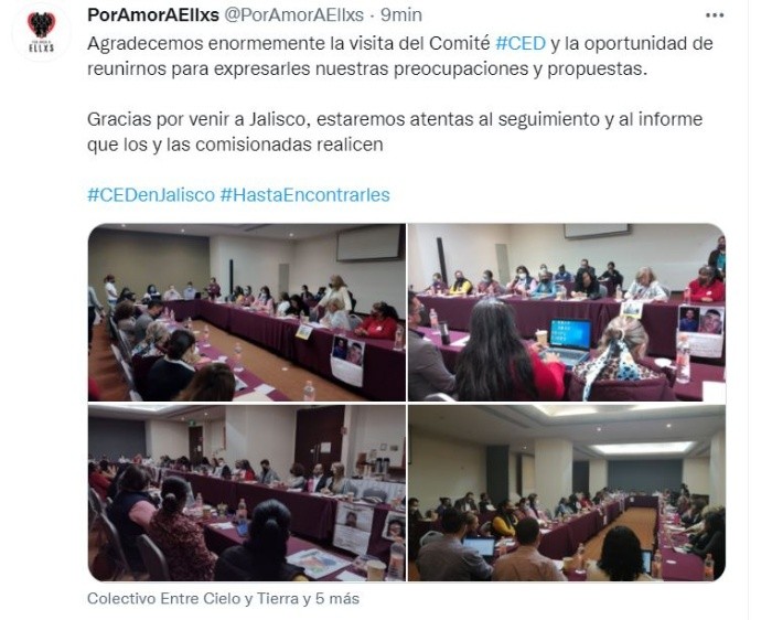En el marco de su visita a México, el Comité contra las Desapariciones Forzadas de la Organización de las Naciones Unidas (ONU) se reunió este viernes con representantes de los diversos colectivos de familias en busca de sus desaparecidos en Jalisco.Lo anterior, con la finalidad de conocer y abordar la problemática respecto de este situación en el Estado, relacionado también con la crisis forense y de Identificación de personas, así como con la poca capacidad para dar solución a los mismos por parte de las autoridades estatales que las familias han dado a conocer en los últimos años.Desde antes de las 11:00 horas integrantes de diversos colectivos se reunieron a un costado de la Glorieta de la Estampida para acompañar a los representantes que entraron a la reunión sostenida con el comité, la cual se llevó a cabo de manera privada en un hotel de la zona.“Estamos conscientes de las problemáticas en búsqueda, investigación, identificación de restos, seguridad de las personas que promueven la búsqueda de sus hijos, hermanos, padres, esposos y estamos muy conscientes además de la importancia de desarrollar estrategias de prevención para parar este fenómeno de la desaparición, y esa es la razón por la cual el comité está aquí, estamos tratando de articular lo que hacemos con las autoridades, con los colectivos, con la sociedad civil para tener una visión general, pero además tener las diversas perspectivas del problema”, explicó Juan Pablo Albán, relator del Comité de la ONU, al término de la reunión.Será entre marzo y abril del 2022 cuando se expongan las conclusiones de las reuniones sostenidas en esta visita por cuatro de los 10 integrantes del Comité de la ONU, incluyendo la desarrollada en Jalisco, una vez que sesione en plenaria una propuesta de informe para emitir recomendaciones a las autoridades del País y de los gobiernos locales, dijo.Por lo pronto, el próximo viernes en rueda se prensa se presentarán las conclusiones iniciales y observaciones generales de las visitas llevadas a cabo.“Cuando hayamos acabado ese ejercicio de recopilar la información nos sentaremos a conversar hacia dónde hay que avanzar”, añadió Albán.Para las personas integrantes de estos colectivos la visita del comité a nuestro Estado representa una esperanza de que la problemática pueda ser atendida y de que las autoridades puedan hacer su trabajo con efectividad, no solo para tratar de encontrar a los más de 14 mil desaparecidos que hay en la Entidad, sino para prevenir que sigan desapareciendo.“No creíamos que algún día íbamos a tener la oportunidad de algún día estar reunidos con ellos pero gracias a Dios nos fue muy bien. Se llevaron nuestros escritos con nuestras propuestas. (En la reunión) pusimos nuestra forma de pensar, cómo queremos que trabaje el Gobierno con nosotros y que todas las instituciones se haga una sola y nos den la atención que merecemos como víctimas, que cumplan los protocolos. La visita sí es una esperanza, pero vamos a dejar la esperanza y lo vamos a convertir en realidad. Hay que ser positivos y ya tenemos el primer paso, el que la ONU nos esté acompañando”, dijo por ejemplo Adriana, fundadora del colectivo 1 = Todos Tlajomulco, al término de la reunión.Entre los temas que se abordaron durante la reunión, además de la falta de coordinación entre las autoridades, así como la falta de personal en áreas de identificación dentro del Instituto Jalisciense de Ciencias Forenses, se encontró también la falta de socialización y difusión de las fichas de búsqueda de la Alerta Amber en el Estado, así como la urgencia de la construcción del Centro de Identificación Humana en la Entidad y del Panteón Forense que se construye en el municipio de Atotonilco El Alto para la inhumación de Personas Fallecidas Sin Identificar, el cual lleva un avance de alrededor del 40%.“Yo creo que ya ganamos con el hecho de que ellos volteen a ver la problemática que hay en México, porque esto ya rebasó al sistema, ya no pueden con ella. Yo pienso que con esta reunión, con que ellos asistan a varios estados y vean la problemática, ellos nos ayuden a comenzar, porque esto no se puede cortar de tajo, pero pueden sentar un cambio, que promuevan y presionen a quien tengan que presionar para que esto cambie y que ya no le suceda a ninguna persona más”, dijo por su parte Liliana Meza, del colectivo “Luz de Esperanza”.JL