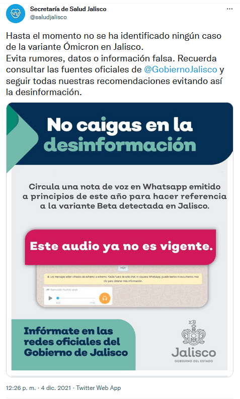Aunque ahora circula un audio afirmado que en Jalisco hay cuatro casos de una variante sudafricana o brasileña del coronavirus, a través de redes sociales la Secretaría de Salud Jalisco (SSJ) recordó que esta se refiere a una nota de enero de este año, que habla de la variante beta, por lo que ya no es vigente y desmiente que sea sobre la cepa ómicron.La nueva variante que circula es ómicron y, hasta el momento, solo se ha encontrado un caso en la Ciudad de México: una persona de 51 años proveniente de Sudáfrica que tiene "enfermedad leve" y que ahora mismo está en un hospital privado de dicha ciudad.Por ello, la secretaría pidió a la población informarse en fuentes oficiales.OF
