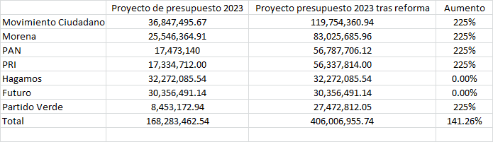 Luego de la reforma que eliminó #SinVotoNoHayDinero, los partidos políticos nacionales con registro estatal recibirán el próximo año 225% más de recursos estatales que lo contemplado en el anteproyecto de presupuesto 2023 que había aprobado el Instituto Electoral del Estado (IEPC).Movimiento Ciudadano es el principal beneficiado pues en lugar de recibir 36.8 millones de pesos (mdp) dispondrá de 119.7 millones. En el caso de Morena tendrá una bolsa de 83 millones, cifra mayor a los 25.5 mdp que le correspondían con la anterior legislación.Otros que ganaron recursos son PAN y PRI, antes de modificar la ley iban a recibir 17.4 y 17.3 millones respectivamente; tras la reforma constitucional aprobada en fast track les corresponderán 56.7 y 56.3 mdp. El Partido Verde accederá a 27.4 millones en lugar de 8.4 mdp que le iban a tocar con la fórmula anterior.En lo referente a los partidos locales Hagamos y Futuro, no les modifican la proyección de presupuesto y les corresponden 32.2 y 30.3 millones respectivamente.El IEPC modificó el anteproyecto de presupuesto del próximo año para ajustarlo a la fórmula vigente para asignar prerrogativas estatales a partidos nacionales.La bolsa total para los partidos que era de 168.2 millones se elevó a 406 millones que recibirán el próximo año.Los fondos estatales entregados a los partidos nacionales incrementaron luego de que, vía una reforma constitucional, se aumentó de 20% a 65% el valor de la Unidad de Medida y Actualización considerado para multiplicar por el total del padrón electoral y definir los montos a distribuir entre los partidos.JL