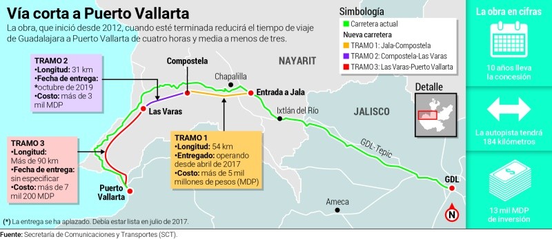 La apertura del segundo tramo de la vía corta a Puerto Vallarta que va de Compostela a Las Varas, aplazado en repetidas ocasiones, tiene una nueva fecha: octubre de este año. Así lo revela un informe publicado en febrero pasado por el Centro Nayarit de la Secretaría de Comunicaciones y Transportes (SCT).Este segmento carretero ya ha sido pospuesto en dos ocasiones. Dos funcionarios federales, Salvador Fernández Ayala, ex director de la SCT en Jalisco y Enrique Peña Nieto, ex presidente de México, se habían comprometido a terminarlo primero en diciembre de 2017 y después en julio del año pasado.El Presidente Andrés Manuel López Obrador puso un ultimátum a la empresa constructora encargada de la obra de esta autopista que va de Jala a Puerto Vallarta. El Mandatario señaló que la empresa lleva más de 10 años con la concesión para hacer la autopista y que aún no tiene avances. “Ya voy a hablar con ellos. Se acabó, o trabajan y terminan o se les quita la concesión”.Una vez terminada esta autopista, que mide alrededor de 184 kilómetros, reducirá a menos de tres horas el traslado de Guadalajara a Puerto Vallarta.Los trabajos en el tercer tramo han presentado contratiempos en la obtención de permisos ambientales y la liberación de derechos de vía. La construcción en esta parte de la carretera fue concesionada a la empresa Impulsora del Desarrollo y el Empleo en América Latina (IDEAL) del Grupo Carso el cual pertenece al empresario Carlos Slim.Al respecto del retraso en la vía corta que señaló el Presidente Andrés Manuel López Obrador (AMLO), Grupo Carso aseguró que “se cuenta con diversos frentes de trabajo a lo largo del tercer tramo y la obra está en total cumplimiento del programa vigente”.La empresa, propiedad de Carlos Slim, explicó en un comunicado que el segundo segmento que no les compete tiene frenadas las obras.“Los tramos Jala-Compostela y Compostela-Las Varas, concesionados al Fonadin, fueron contratados para su construcción por el concesionario. Es de nuestro conocimiento que el tramo Jala-Compostela ya se terminó y el tramo Compostela-Las Varas muestra un avance, pero sus trabajos fueron suspendidos hace varios meses”.Mientras que el segmento Las Varas-Vallarta se encuentra concesionado a Ideal (filial de Grupo Carso) desde junio de 2016, la cual recibió la autorización por parte de la SCT para el inicio de la obra preparatoria con fecha 30 de agosto de 2018 y la más reciente en abril de 2019.