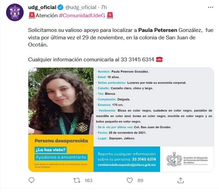 A través de sus redes sociales, la Universidad de Guadalajara solicitó apoyo para localizar a Paula Petersen González, estudiante de la institución y quien fue vista por última vez el 29 de noviembre, en la colonia San Juan de Ocotán.De acuerdo con la ficha de búsqueda emitida por la Comisión de Búsqueda de Personas del Estado de Jalisco, Paula Petersen tiene 16 años, es de tez blanca, complexión delgada y mide 1.70 de estatura.La última vez que se le vio, la menor vestía blusa y sudadera negra, pantalón de mezclilla azul y botas negras; asimismo, llevaba consigo una mochila y un bolso pequeño en color negro.En caso de saber cualquier información sobre el paradero de la joven, solicitan comunicarse al número 33 3145 6314.El Protocolo Alba propicia desde el primer minuto la cooperación efectiva entre autoridades locales, estatales y federales, así como de la sociedad y medios de comunicación, a fin de tener acciones de búsqueda más efectivas de mujeres desaparecidas.El protocolo se aplica en todos los casos de niñas, adolescentes o mujeres cuyo paradero o ubicación se desconoce, aun cuando no exista sospecha de crimen, dado que los instantes inmediatos a la desaparición son muy relevantes para la búsqueda e investigación.Inicia con la llamada al 911 o reporte ante cualquier autoridad o bien, la denuncia ante las instituciones policiales, mediante aplicaciones de teléfonos inteligentes o directamente ante el agente del Ministerio Público.JM