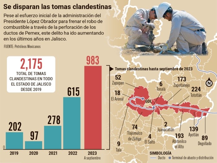 Como una de sus primeras acciones en 2019, el Gobierno de Andrés Manuel López Obrador lanzó una ofensiva para frenar el robo de combustible, lo que produjo desabasto en el territorio nacional mientras se supervisaban los ductos para hallar fugas. Esto provocó que durante semanas los habitantes batallaran para conseguir gasolina en las diferentes estaciones de servicio ubicadas principalmente en la Zona Metropolitana de Guadalajara (ZMG). En el caso de Jalisco, la medida tuvo resultados positivos y se redujo el hallazgo de tomas clandestinas en la anualidad posterior. En ese entonces pasaron de mil 549 en 2018 a 202 en 2019. Sin embargo, entre 2022 y 2023 la vigilancia de las autoridades federales se relajó, por lo que se volvió a disparar la cantidad de ordeñas en los ductos de Petróleos Mexicanos (Pemex) a lo largo de la Entidad. “Fue una buena iniciativa eliminar el tema del ‘huachicoleo’, como lo llamó el Presidente, frenar a las organizaciones criminales que se dirigieron hacia ese tipo de actividades que les redituaban mucho dinero. Pero fue una política que estuvo en vigencia menos de un año. Ya no hay control, ya no hubo un seguimiento, no hay una política para verdaderamente disminuir este problema”, expresó Rogelio Barba Álvarez, investigador en materia de Criminología y Derecho Penal de la Universidad de Guadalajara (UdeG).El experto expresó que el Ejército y las autoridades federales deberían priorizar la vigilancia de la infraestructura de Pemex sobre otras actividades que no impactan en la seguridad nacional.En esta administración federal, Jalisco es la séptima Entidad con mayor cantidad de tomas clandestinas, detrás de Hidalgo, Estado de México, Puebla, Veracruz, Tamaulipas y Guanajuato. Entre los municipios más afectados en el Estado están Tototlán, Atotonilco El Alto, Zapotlanejo, Ayotlán, Degollado, Tlajomulco de Zúñiga y Zapopan.