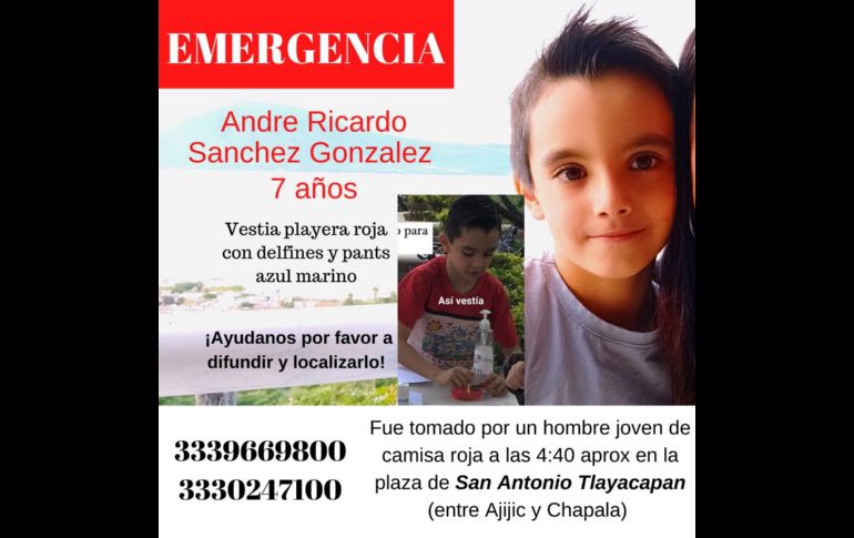 Andre Ricardo Sánchez González, de 7 años de edad, desapareció hoy por la tarde en la plaza de San Antonio Tlayacapan, una localidad ubicada a un costado del Lago de Chapala.De acuerdo con la primera información difundida, el menor se encontraba realizando actividades de manualidades artísticas junto con otros niños en el lugar cuando se le vio por última vez.Según los testigos, a las 16:40 horas de hoy se lo llevó un hombre de alrededor de 38 años, tez morena y complexión atlética, cabello negro y barba corta. El hombre, que usaba playera roja, se habría acercado a él amistosamente y le habría pedido que lo acompañara.El niño vestía playera roja con delfines y un pants azul marino.Se informó que la alerta Amber ya está en proceso.La familia del menor agradece cualquier información que se conozca sobre el caso a los números: 3339669800 y 3330247100