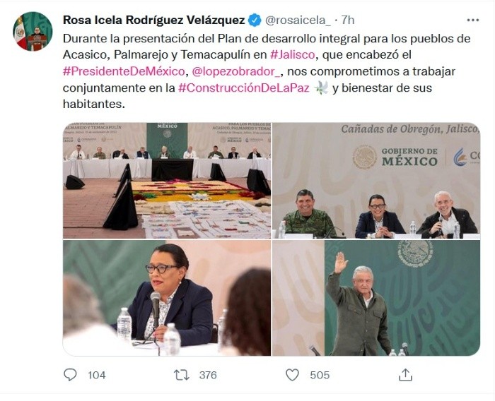 Representados por su vocera, María de Jesús, conocida como "Marichuy", pobladores de Temacapulín agradecieron al Presidente Andrés Manuel López Obrador (AMLO) por haberlos salvado de la "hidromafia" que buscaba inundar sus pueblos para llevar a agua a las industrias y al estado de León Guanajuato a través de la construcción de la presa El Zapotillo, pues el proyecto original no sólo contemplaba el recurso para la Zona Metropolitana de Guadalajara."Se nos vino el mundo encima y tuvimos que salir a arañar y a defendernos como Dios nos ha dado a entender. Porque hemos sido tratados con la punta del pie y eso vino a traer una crisis de incredibilidad por los que están en el poder. Señor Presidente, gracias por venir a salvarnos de esta hidromafia. Yo estoy cansada, yo ya me voy, pero acordémonos que el futuro es de los jóvenes y de los venideros. Muchas gracias. ¡Temaca vive, Temaca sigue y sigue!", expresó Marichuy durante la reunión sostenida en la plaza principal de Temacapulín a la cual, además de AMLO, también asistieron diferentes secretarios del gobierno federal.Marichuy señaló que la lucha contra este "megaproyecto de muerte" emprendida por más de 16 años siempre fue apartidista, pero que los gobernantes federales y locales, incluyendo al actual gobernador de Jalisco, siempre les dieron la espalda y los condenaron al destierro de sus tierras, y que fue hasta ahora, con el diálogo comenzado por el Presidente, que la lucha se acerca a su fin, una vez que sean cumplidos los pactos del Mandatario y que se realice la reparación integral del daño de los pobladores."Hoy queda demostrado que cuando el pueblo lucha por su dignidad, justicia, sin olvidar su identidad, queda en los hechos que existe el diálogo en favor de la vida, y caminar juntos en armonía, paz y tranquilidad, que es lo que hemos deseado. Esta lucha se ha ganado por el pueblo, porque nunca perdimos la esperanza", añadió Marichuy durante su intervención.Por su parte, Christian Gómez, representante y vocero de Palmarejo, añadió que los acuerdos a los que se han llegado, en los cuales, de acuerdo con AMLO, se dará cumplimiento a las peticiones de los pobladores para la reparación del daño de las y los habitantes afectados por los estragos del proyecto inicial de El Zapotillo, representan que "cuando hay voluntad se gobierna con voluntad".Los logros que se han obtenido, señaló el joven, han sido gracias a la lucha y resistencia que las y los pobladores llevaron por poco más de 16 años, "para que ningún gobierno se quiera colgar medallas publicando en redes sociales que se debió a ellos", expresó.Además pidió que después del proyecto ejecutivo de la presa, así como el calendario de obra, se entregue una copia de estos a las comunidades, incluyendo además una maqueta física a escala para que todas y todos puedan analizar el proyecto conjunto. También se deberá establecer una mesa técnica de seguimiento al proyecto, además de la modificación del decreto presidencial para que el agua que vierta la presa, que quedó con un embalse de 40 metros de altura, sea direccionada a los habitantes de Guadalajara que más lo necesiten, sin dejar sin el recurso a los pobladores de estas comunidades.De acuerdo con María González, coordinadora de Área de Defensa de Territorio del IMDEC, si bien esta visita del Presidente y su gabinete representan la continuación de los trabajos ante los compromisos establecidos por el Mandatario, "lo que sí se debe garantizar es que, según lo ha dicho formalmente la Conagua, el vertedor requiere de un año para su construcción. Es decir, que la presa sí estaría terminada y puesta en operación antes de que termine este gobierno".A la reunión sostenida este miércoles, además del Presidente, del alcalde de Cañadas de Obregón, y del Gobernador de Jalisco, quien no tuvo participación en el diálogo, asistieron más de 20 secretarios y funcionarios del gabinete de AMLO que intervendrán en los apoyos que se brindarán a las y los pobladores de Temacapulín.Entre ellos, la secretaria de Seguridad y Protección Ciudadana, Rosa Isela Rodríguez, celebró que con la firma de este acuerdo se pone fin a una problemática y da inicio a una nueva era a partir del diálogo para la resolución de conflictos. De acuerdo con el SESNSP, dijo, los delitos más representativos la región en la que se ubican estos poblados han sido amenazas, daños a la propiedad y extorsión, por lo que puso a la Secretaría a disposición de sus habitantes, para emprender una coordinación y trabajar en conjunto en favor de su seguridad, poniendo a su disposición a elementos de la Guardia Nacional.Javier May Rodríguez, titular de la Secretaría de Bienestar, indicó que del 3 al 6 de noviembre se cansaron 106 viviendas en los tres poblados, sumando a 12 nuevos derechohabientes que no habían sido incorporados a los programas, mismos que se suman a los 98 que ya recibían apoyos del Programa de Bienestar. Al concluir este año, dijo el funcionario, se habrán invertido un millón 589 mil pesos en apoyos a habitantes de Temacapulín, Acasico y Palmarejo.El titular de la SCT, Jorge Arganis Diaz, aseguró que se trabajarán en las calles y caminos como lo solicitaron los pobladores, priorizando tres tramos de mayor urgencia, y que para ello se invertirán 47.5 millones de pesos que ya están considerados para el ejercicio fiscal de 2022.Víctor Manuel Villalobos, secretario de Agricultura y Desarrollo Rural, señaló que se brindarán apoyos para reactivar el campo en agricultura y ganadería "para dignificar la vida de estos municipios y que sea parte de la dinámica estatal", a través de acciones en conjunto con el gobierno de Jalisco que impulsarán cultivos como forrajes, hortalizas, agave, maíz, sorgo y chía, con tecnificación de riego.Por otra parte, Pedro Arrojo, del Alto Comisionado de las Naciones Unidas en temas de agua, agradeció a las y los pobladores que permanecie