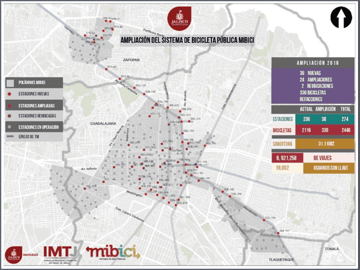 A diez días de concluir su administración, el gobernador Aristóteles Sandoval Díaz, puso en marcha la tercera etapa del programa MiBici, inauguró obras de repavimentación en Periférico Sur y avenida Ávila Camacho. El programa de bicicletas públicas se amplió hacia Zapopan, siguiendo el trazo de la Línea 3 del Tren Eléctrico. Se suman 38 estaciones nuevas y se ampliaron 24 ya existentes por la alta demanda que presentan. También serán reubicadas dos estaciones en la zona Centro de Zapopan, por baja demanda de usuarios, y se colocaron en las inmediaciones de la Prepa 10 y el Mercado del Mar. El gobernador destacó que Mi Bici superó los siete millones de viajes, en su mayoría de personas que dejaron de usar el automóvil. "Regresar a la comunicación del transporte alternativo, transporte no motorizado sin contaminantes, pero también pensar en el peatón", comentó.El director del Instituto de Movilidad, Mario Córdova España, detalló que con esta tercera etapa ya son 274 estaciones con 2 mil 446 bicicletas que cubren una extensión de mil 100 hectáreas en los municipios de Guadalajara, Zapopan y Tlaquepaque. Se invirtieron 55.8 millones de pesos en la ampliación. Añadió que se compró un lote de refacciones para cambiar asientos, manubrios y timbres dañados. "Actualmente en un día laboral se hacen 12 mil viajes diarios en el sistema, con tendencia a un crecimiento fuerte y más en las estaciones que tienen intermodalidad con el transporte masivo", comentó. El gobernador Aristóteles Sandoval, realizó recorridos por la zona de avenida Ávila Camacho y en Periférico Sur, para dar por concluidos los trabajos de repavimentación en ambos puntos. En el caso de Ávila Camacho se colocó concreto hidráulico de avenida Patria a la calle Santa Elena. Además, se hicieron obras de renovación de banquetas, colocación de rampas y guías podotáctiles. En estos trabajos se reportó inversión de 210 millones de pesos. En Periférico Sur se intervinieron 12 kilómetros para colocar concreto hidráulico en el tramo de carretera a Chapala a El Mante. El secretario de infraestructura y obra pública, Netzahualcóyotl Ornelas Plascencia, informó que la intervención incluyó rehabilitación de luminarias, colocación de barrera central y señalética. El funcionario reiteró que el concreto colocado cumple con las especificaciones necesarias para que en su momento opere el Peribús, si el proyecto de camión articulado avanza en la siguiente administración. Estas obras tuvieron costo de 700 millones de pesos. La presidenta municipal de Tlaquepaque, María Elena Limón, aprovechó el acto para agradecer al Gobernador por el apoyo durante su gestión. En tono de despedida, la alcaldesa refirió que pese a algunas diferencias lograron trabajar en equipo. LS