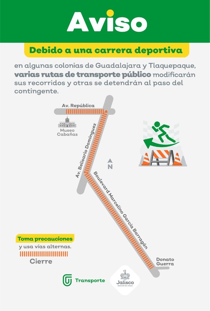 Debido a dos carreras atléticas que se llevarán a cabo este sábado en los municipios de Guadalajara y Tlaquepaque, varias rutas del transporte público detendrán su recorrido y otras lo desviarán, según informó este viernes la Secretaría de Transportes.En el caso del municipio de Guadalajara se dará en el horario matutino, mientras que en el caso del municipio de San Pedro Tlaquepaque, será en la noche, teniendo las siguientes modificaciones:La primera iniciará a las 7:00 de la mañana y el punto de salida y meta será a un costado del Centro Universitario de Ciencias Exactas e Ingeniería, en el boulevard Marcelino García Barragán, en el municipio de Tlaquepaque.El recorrido de los participantes iniciará sobre el boulevard Marcelino García Barragán, para avanzar hacia la calle Constancia, donde retornarán por la misma vía hacia el oriente. Al llegar a la avenida Olímpica girarán a la izquierda, donde continuarán hasta la calle Justo Corro para retornar de nuevo en dirección al boulevard Marcelino García Barragán, en la cual girarán a la derecha hasta encontrarse con la meta.Las rutas C52, C58 Jauja, C60 Santa Isabel, C61 Santibáñez, C87, C96-V1 Cofradía, C96-V2 Santibáñez, T09 Circuito Oblatos, T15-C04 LA Villa, T15-C04 El Quince, T15-C04 Manantial y 707, que en su trayecto de ida circulan sobre boulevard General Marcelino García Barragán, se desviarán por la Calzada Olímpica, después tomarán la avenida Revolución para seguir su ruta habitual.En su trayecto de regreso, circularán por avenida Revolución, se desviarán en la Calzada Olímpica y seguirán su recorrido normal por el boulevard Marcelino García Barragán.Por su parte las rutas C19, C97-V1, C97-V2, y T13C Agua Blanca - Centro Médico, al circular por el boulevard Marcelino García Barragán, se desviarán en la Calzada Olímpica, seguirán por la avenida Revolución, después por la calle Constancia para continuar su derrotero.De regreso, de ir sobre Calzada del Ejército, se desviarán hacia avenida Revolución, seguirán por Calzada Olímpica y después tomarán el boulevard Marcelino García Barragán para continuar su ruta habitual.En lo que respecta a las rutas C38-V1 La Punta - Vocacional y C38-V2 CUTonalá – Vocacional, de circular por la calle Corregidora, se desviarán en avenida Revolución, después tomarán Dr. Pérez Arce para continuar su recorrido.A su vez las rutas T11B y T13C-C02, que en su sentido hacia la antigua Central de Autobuses circulan por el boulevard Marcelino García Barragán, se desviarán por la Calzada Olímpica, después tomarán la avenida 5 de Febrero para retomar su ruta.En sentido contrario, al regresar por calle Los Ángeles, iniciarán su desvío en Calzada del Ejército, luego tomarán la avenida 5 de Febrero, después la Calzada Olímpica y en boulevard Marcelino García Barragán continuarán su ruta habitual.La ruta C06, que en su trayecto de ida va por el boulevard Marcelino García Barragán, se desviará en la Calzada Olímpica y en la avenida Revolución seguirá su ruta normal. Las rutas C34 y C59, detendrán su recorrido al llegar a la calle Corregidora, entre el boulevard Marcelino García Barragán y Av. Revolución.Las rutas C24, T15 Hospital Civil-Río Nilo, T15 Dos Templos y T15-1 Central Nueva detendrán su trayecto al llegar a Av. Revolución, en el tramo comprendido entre Corregidora y Calzada Olímpica.La segunda carrera iniciará a las 8 de la noche en la explanada del Hospicio Cabañas, en el municipio de Guadalajara, y tendrá como meta la Pila Seca, en el municipio de San Pedro Tlaquepaque.Los participantes saldrán de un costado de la explanada del Hospicio Cabañas en la avenida República del municipio de Guadalajara, para avanzar hacia el oriente por la misma avenida, girarán a la derecha en Belisario Domínguez, cruzarán la avenida Revolución para continuar por Calzada del Ejército y seguirán por el boulevard Marcelino García Barragán hasta llegar a la Pila Seca, en las calles Donato Guerra y avenida Niños Héroes del municipio de Tlaquepaque, donde se encontrarán con la meta.La ruta SITREN L3, en su trayecto de regreso, de la avenida Hidalgo se desviará en la Calzada Independencia, después tomará la calle Juan Manuel, seguirá por Federación, después por Ramón Morales y en avenida República continuará su derrotero.En lo que respecta a las rutas C19, C96-V1 Cofradía, C96-V2 Santibáñez, T09 Circuito Oblatos, C52, C87 y T15-C04 tres vías, en su trayecto de ida por la avenida Niños Héroes, se desviarán hacia la avenida Revolución, seguirán por la calzada Olímpica, después tomarán el boulevard Marcelino García Barragán y al pasar el contingente de corredores continuarán su ruta acostumbrada.En su trayecto de regreso, del boulevard Marcelino García Barragán se desviarán por la calzada Olímpica, después tomarán la avenida Revolución, luego Ramón López Velarde y en la avenida Niños Héroes retomarán su ruta.Por su parte, la ruta C06, al circular por la avenida Niños Héroes, se desviará en la avenida Revolución y continuará su recorrido.Mientras que la ruta T11B-C01, de venir por la avenida Niños Héroes, iniciará su desvío en la avenida Revolución, después tomará la Calzada Olímpica para continuar su ruta. En sentido contrario, circulará por Calzada Olímpica, se desviará en avenida Revolución, luego tomará la calle Ramón López Velarde para retomar su recorrido en la avenida Niños Héroes.Por último, la ruta C05 Oblatos, de la avenida Niños Héroes se desviará para tomar avenida Revolución y después la calle Mota Padilla, para luego continuar su ruta habitual.En sentido inverso, circulará por la calle Irineo Paz, se desviará en la avenida Revolución, después tomará Ramón López Velarde para retomar su ruta en la avenida Niños Héroes.En el boulevard Marcelino García Barragán, de Donato Guerra hacia la avenida Niños Héroes de poniente a oriente, se d
