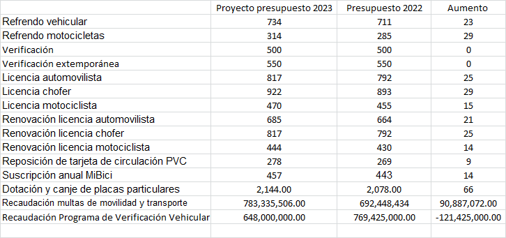 La iniciativa de Ley estatal de Ingresos 2023 incluye aumento de 23 pesos en el cobro del refrendo vehicular, pues el planteamiento del gobierno estatal es que los propietarios de automóviles paguen 734 pesos.Continúan los incentivos por pronto pago, durante enero habría un descuento de 10%, en febrero y marzo, de 5 por ciento. Los contribuyentes deberán cubrir como “aportación” 61 pesos adicionales al refrendo, de los cuales 33 se destinarán a la Cruz Roja y 28 para el Hogar Cabañas. Estarán exentos de este pago los vehículos eléctricos e híbridos. Se contempla el pago adicional de 34 pesos de aportación a la Cruz Roja y 29 para el Hogar Cabañas; quedarían exentos de este pago los vehículos eléctricos e híbridos.En el caso de las motocicletas, el refrendo será de 314 pesos, 29 más que el costo actual. El trámite de la licencia de conducir para automovilista costará 817 pesos.También hay ajustes para los usuarios de MiBici que pagarán 457 pesos por la suscripción anual, 14 más que actualmente.La verificación vehicular no tendrá incremento para el próximo año y se mantendrá en 500 pesos y 550 si se realiza fuera del calendario programado por número de placa. Proyectan recaudar 648 millones de pesos por este concepto, esto representa una disminución de 121.4 millones en comparación con lo que se consideró este año.La iniciativa de Ley estatal de Ingresos contempla descuentos para los propietarios de vehículos que hayan cumplido con verificar este año. Recibirán 10% de descuento en el pago de derechos por refrendo vehicular y tarjeta de circulación; será adicional a las rebajas que se otorgan por pronto pago y a los pagos efectuados a través de Internet, ventanillas bancarias y tiendas de conveniencia.Quienes hayan verificado podrán recibir 20% de descuento en el derecho por dotación de placas a los vehículos foráneos.Por concepto de multas de movilidad y transporte se calcula recaudar 783.3 millones de pesos, lo que representa 90.8 millones más que lo considerado para este año.GC