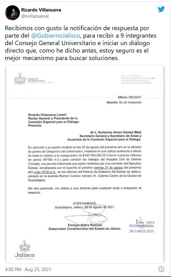 Luego de que el pasado viernes el secretario general de la Universidad de Guadalajara (UdeG), Guillermo Gómez Mata, solicitara audiencia con el gobernador de Jalisco para que una comisión especial dialogue sobre la reasignación de 140 millones de pesos, agendaron para el próximo viernes 27 de agosto la charla entre las partes.El despacho del gobernador emitió un comunicado alrededor de las 13:31 horas notificando a Gómez Mata sobre su reciente acercamiento en Casa Jalisco, a donde llevó una solicitud formal a la oficialía de partes con la exigencia de dialogo por reasignación de los 140 MDP que estaban ya etiquetados para el Museo de Ciencias Ambientales y que ahora se pretende utilizar para terminar con labores del Hospital Civil de Oriente en Tonalá.“Me permito informarle que serán recibidos por una comisión del Ejecutivo estatal, encabezada por el suscrito el próximo viernes 27 de agosto del presente año a las 10:00 a.m. en las oficinas del Palacio de Gobierno del Estado de Jalisco, ubicado en Ramón Corona número 31, colonia Centro de la ciudad de Guadalajara”, detalló el escrito firmado por el mandatario local.Por su parte, el rector de la UdeG, Ricardo Villanueva, mostró su postura en redes sociales luego de recibir respuesta del oficio.“Recibimos con gusto la notificación de respuesta por parte del Gobierno de Jalisco, para recibir a nueve integrantes del Consejo General Universitario e iniciar un diálogo directo que, como he dicho antes, estoy seguro es el mejor mecanismo para buscar soluciones”, destacó en un tuit.El trasfondo de las diferencias entre el Estado y la UdeG comenzó el viernes 6 de agosto. La fracción emecista anunció que el diputado Daniel Robles de León pidió al gobernador que se realicen las modificaciones a la partida presupuestal 41565 de transferencias internas otorgadas a entidades paraestatales no empresariales y no financieras para la inversión pública.Esto planteaba la reasignación de 140 millones de pesos de la partida que era destinada al Museo de Ciencias Ambientales de la Universidad de Guadalajara, los legisladores la consideraron como una partida sub ejercida del Presupuesto de Egresos 2021, para destinarla a la Construcción del Hospital Civil de Oriente en Tonalá.Si te interesó esta noticia y quieres saber más, entonces descarga y descubre INFORMAPlus, la aplicación digital de EL INFORMADOR, en donde tenemos contenidos exclusivos, seleccionados por nuestros editores, para darles una experiencia más completa a los lectores. Si eres suscriptor de EL INFORMADOR tu acceso está incluido, solicítalo al 33 3678-7777Descarga la aplicación y pruébala GRATIS por treinta días.Para iOS: https://apple.co/35jaVgbPara Android: https://bit.ly/3gwVSEVJM