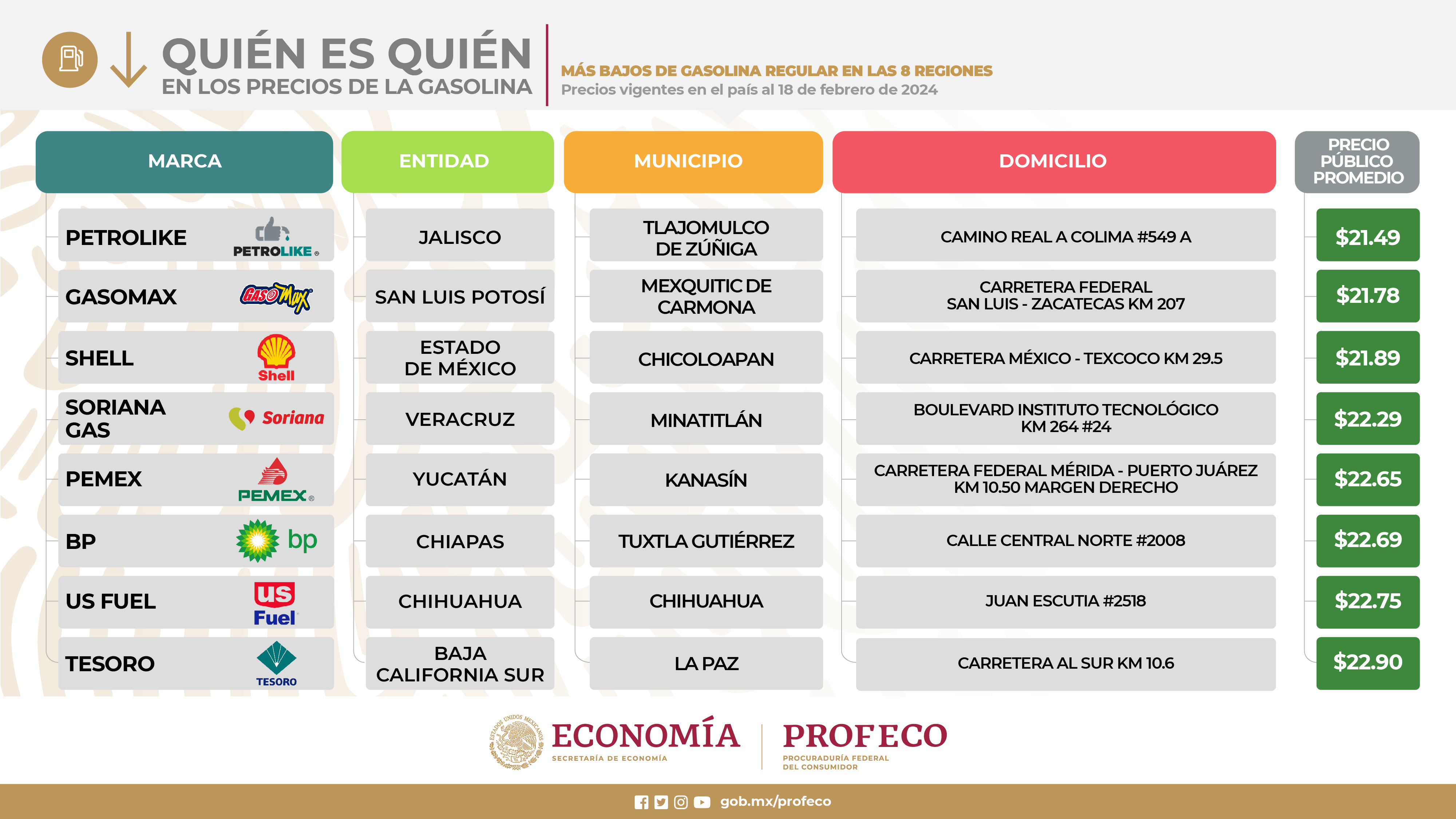 La Procuraduría Federal del Consumidor (Profeco), informó este lunes en la sección "Quién es quién en los precios de la gasolina", los establecimientos con los precios más altos y más bajos de gasolina regular en las regiones de México.En la conferencia de prensa matutina del Presidente Andrés Manuel López Obrador, se mencionó que en Jalisco, concretamente en Tlajomulco de Zúñiga se encuentra una marca con el precio más bajo de gasolina.Se trata de Petrolike, ubicada en Camino Real a Colima #549 A, con un precio al público promedio de 21 pesos con 49 centavos. *Mantente al día con las noticias, únete a nuestro canal de WhatsApp aquí: https://whatsapp.com/channel/0029VaAf9Pu9hXF1EJ561i03MV
