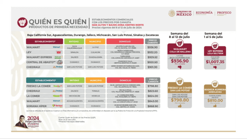 En la conferencia mañanera del presidente López Obrador, la Procuraduría Federal del Consumidor (Profeco) a través de la voz de David Aguilar Romero y en la sección "Quién es quién en los precios de la canasta básica" presentó a los supermercados con precios más altos y más bajos del país. El estudio fue realizado con datos de la semana anterior.El análisis económico se hace a través de un división del país en cuatro regiones: centro, centro norte, norte y sur. Jalisco pertenece a la segunda parte de dicha lista, y en esta ocasión, el estado logró ingresar a la diapositiva de la Profeco, en la que se muestran a los cinco supermercados más baratos y los cinco más caros.En esta ocasión, el establecimiento con el precio más alto para Jalisco y uno de los más caros de la zona centro norte fue el Walmart Express ubicado sobre la calle Turín #2828 en la Colonia Lomas de Guevara en Guadalajara, Jalisco. El precio ofertado para los 24 productos que componen la canasta básica fue de $929.52 pesos, lo que implica una reducción de aproximadamente 50 pesos con respecto a la semana anterior. Eso poco más de un 11 por ciento por arriba del precio más barato que se puede conseguir en Jalisco.El precio máximo establecido por la Profeco es de $1039 pesos.* * * Mantente al día con las noticias, únete a nuestro canal de Whatsapp * * *OB