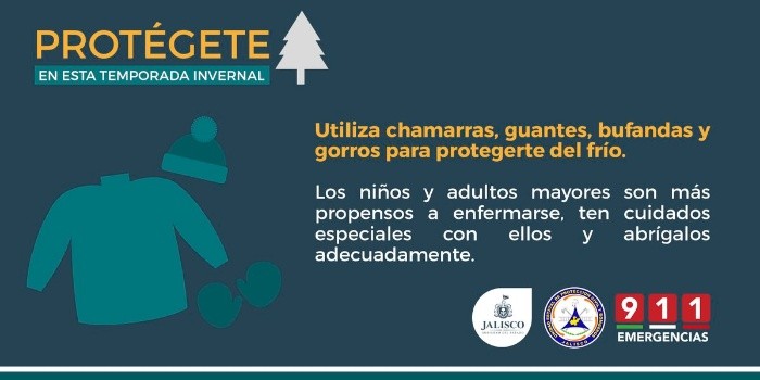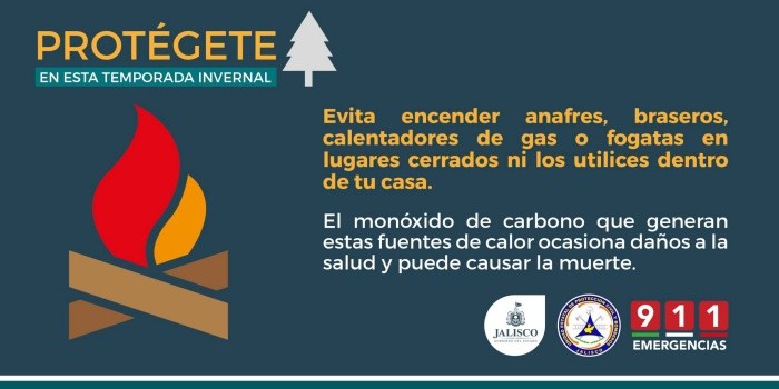 El titular de la Unidad Estatal de Protección Civil y Bomberos de Jalisco (UEPCyBJ), Trinidad López Rivas, recomendó a la población seguir las recomendaciones durante estas vacaciones de invierno.Aconsejó evitar utilizar anafres, braseros, calentadores o fogatas en lugares cerrados o con poca ventilación, ya que los gases y humos tóxicos generados por estos artefactos ocasionan daños a la salud y pueden causar la muerte.Pidió no encender calentadores eléctricos cerca de cortinas, papel o cualquier material combustible, ya que puede provocar un incendio; y durante la noche evitar dejar encendidas veladoras, lámparas o cualquier fuente de calor y apágalas antes de dormir.Además de alejar cualquier líquido de contactos eléctricos, ya que pueden derramarse y ocasionar un corto circuito; y mantener cerradas las ventanas de la habitación, utilizar ropa abrigadora para dormir y las cobijas que sean necesarias.López Rivas indicó que en caso de colocar luces y adornos navideños se deben asegurar que el material sea de alta calidad para evitar que se incendie fácilmente; y para cualquier emergencia comunicarse al 911 o al 36753060.Apuntó que 15 mil oficiales de diferentes dependencias participan en el Operativo Preventivo Temporada Invernal y Año Nuevo en esta entidad, que concluye el próximo 8 de enero de 2018.Precisó que la UEPCyBJ despliega 250 oficiales operativos a bordo de 84 vehículos todo terreno, quienes realizan recorridos de supervisión y vigilancia en las principales carreteras del estado, así como centros turísticos, religiosos, de montaña y las costas norte y sur.Afirmó que cada una de las comandancias regionales se reunió con las autoridades municipales y estatales para lograr una coordinación durante todo el operativo.A su vez, el subdirector de Seguridad Pública del estado, Fernando Andrade Vicencio, resaltó que durante el operativo la Fiscalía General de Jalisco trabaja con tres mil 500 elementos de seguridad pública a bordo de 385 patrullas, 24 motocicletas y 15 binomios caninos.Así como dos centros de mando móviles, ocho torres de vigilancia en el área metropolitana de Guadalajara, dos embarcaciones en el lago de Chapala y dos helicópteros que realizan recorridos intermitentes en la capital de Jalisco.Manifestó que en el interior del estado se mantiene patrullaje en carreteras y en todos los centros turísticos, mientras en área metropolitana se cubren plazas comerciales, zonas donde se comercializan productos navideños y lugares vulnerables por robo a casa habitación.Por su parte, el coordinador operativo del Consejo Estatal para la Prevención de Accidentes en Jalisco (Cepaj), José Parra Sandoval, señaló que a través de la Secretaría de Salud se trabaja de manera coordinada con hospitales Civiles, IMSS e ISSSTE para atender a la población vulnerable a enfermedades en esta temporada de frío.Destacó que el Servicio de Atención Médica de Urgencias (SAMU) trabaja con un estado de fuerza de unidades de terapia intensiva y cuatro ambulancias de atención rápida, que agiliza la coordinación de los traslados de urgencia pre-hospitalaria."A través de la Comisión para la Protección contra riesgos Sanitarios de Jalisco (Coprisjal) se realizará la revisión de alimentos en restaurantes y centros turísticos", concluyó. OF