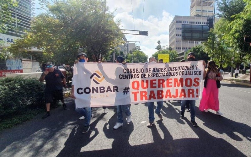 Cerca de dos mil personas se manifiestan esta mañana sobre la avenida Vallarta en Guadalajara, para exigir a las autoridades que les permitan reiniciar operaciones.La manifestación inicio sobre la avenida Vallarta, y se dirige hacia Casa Jalisco, por López Mateos.Cesar García, presidente del Consejo de Bares, Discotecas y Centros de Espectáculos (CONBAR), explicó que ya les habían dado una fecha tentativa para reiniciar operaciones este lunes pero no se cumplió, por lo que decidieron realizar la marcha. “No tenemos claro cuando nos van a dejar abrir, tenemos rato trabajando con ellos (Mesa de Reactivación Económica) y nos han dado fechas tentativas que no se cumplen”.El entrevistado añadió que después de cuatro meses sin operar los negocios ya están quebrados y los trabajadores desesperados porque no han percibido ingresos. “Ya hemos platicado con el gobernador y alcaldes y no tenemos respuesta, ya queremos abrir” concluyó.En Jalisco operan alrededor de tres mil bares y discotecas con licencia de giros restringidos.NR