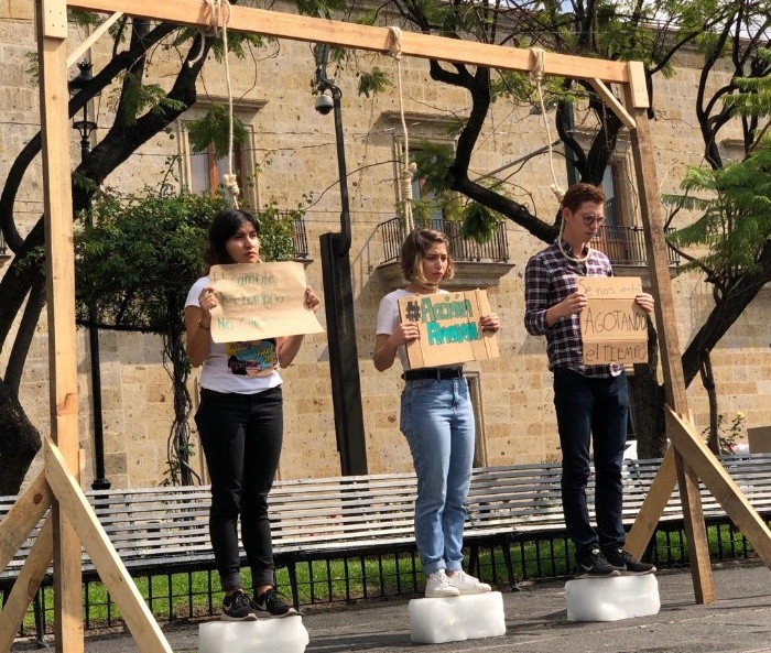 Sobre un bloque de hielo y con una soga al cuello para simbolizar el riesgo que representa el calentamiento global para la humanidad; integrantes del Colectivo Altavoz Jalisco se manifestaron en Plaza Liberación para exigir a las autoridades emprender acciones contra el cambio climático.Tonatiuh Bravo Rosas, presidente del colectivo, informó que presentaron un pliego petitorio al Congreso de Jalisco en el que solicitan puntos como la conformación de una Fiscalía Medioambiental autónoma para prevenir, sancionar y penalizar a quien viole la legislación ambiental. Además, plantean que áreas naturales claves para el Estado, como el Bosque La Primavera, sean expropiadas y se refuerce su protección.“Lo que estamos simbolizando es que con el cambio climático tenemos la soga en el cuello como sociedad y si no actuamos quedaremos colgados. Hay que complementar con propuestas a profundidad, seguir invirtiendo en transporte público. Las autoridades se han quedado en un lugar que están cómodos y estamos en una emergencia, la ciencia lo dice y tenemos que actuar con las mayores acciones que se puedan y eso es lo que venimos a reclamar”, expuso.Bravo Rosas, expresó que las autoridades deben profundizar en las medidas de mitigación que impulsan. Redoblar el trabajo en el tratamiento de aguas, captación de lluvia y el uso de energías renovables.Sobre los cuestionamientos a la senadora jalisciense Verónica Delgadillo, por haber difundido en redes sociales su participación en una marcha contra el cambio climático en Nueva York, el activista comentó que la legisladora debió ser más responsable con la forma como manejó el asunto y primero apoyar el tema desde el país y a nivel local.NM