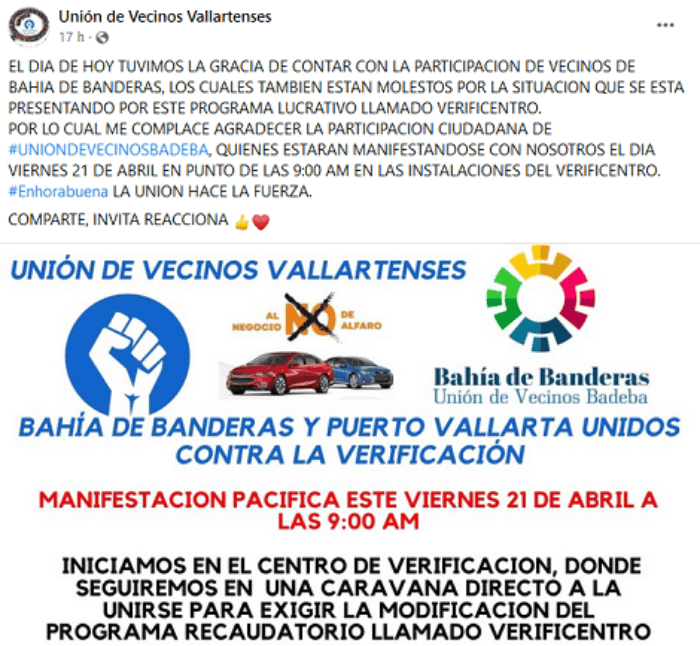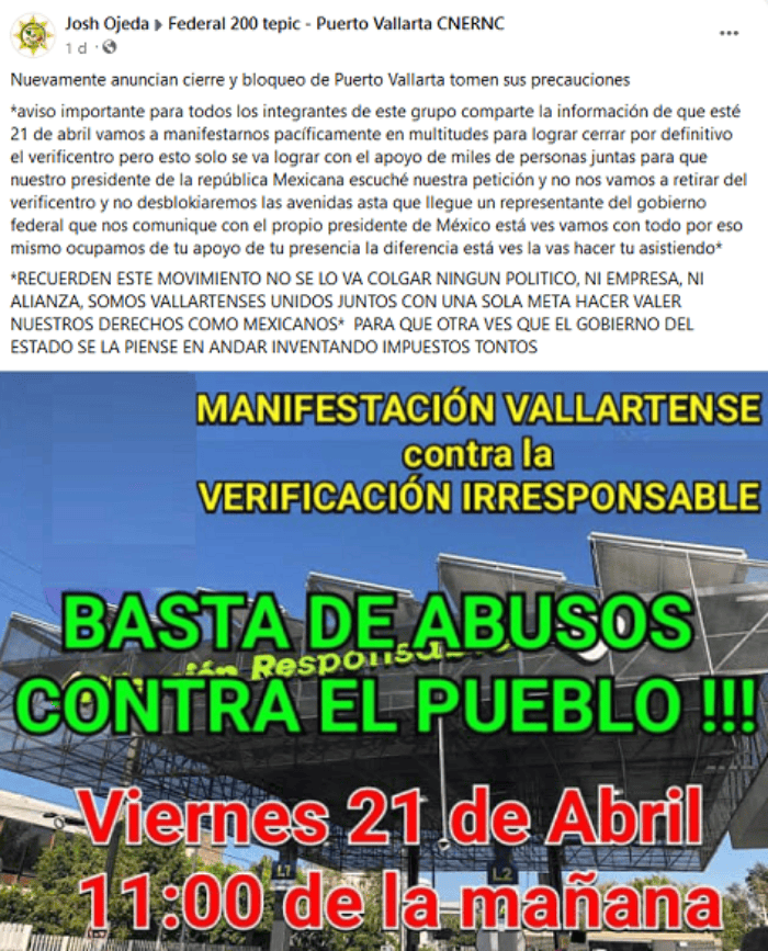 Puerto Vallarta es un punto de manifestaciones ciudadanas en contra del programa de Verificación Responsable del Gobierno de Jalisco, al considerar que la medida tiene nulo impacto en el medio ambiente y se trata únicamente de una disposición recaudatoria.La situación, además, tiene mayor dimensión debido a la ubicación de Puerto Vallarta y su colindancia con Nayarit, que provoca una dinámica particular porque en la circulación vehicular entre ambas zonas proliferan placas de ambas entidades.Fue el pasado 31 de marzo cuando ciudadanos cerraron la avenida Francisco Medina Ascencio, una de las principales, que conecta al centro del destino turístico, con la Riviera Narayit y que lleva al aeropuerto, lo que ocasionó que los propios turistas tuvieran que trasladarse a pie a la terminal aérea para no perder sus vuelos. Patrullas de la policía y tránsito municipal colaboraron en el traslado de visitantes. Pero no fueron los únicos afectados, también las personas que viven en Puerto Vallarta y salían a dicha vía para esperar y abordar el transporte que los lleva a sus lugares de trabajo, padecieron el caos vial que se ocasionó en el área, a la altura de la zona militar, por los cierres debido a las protestas.El caos de aquel día se repetirá. Asociaciones vecinales informaron que el próximo viernes 21 de abril a las 09:00 horas volverán a las calles, en las inmediaciones del Centro de Verificación Responsable 0007, para exigir la modificación del "programa recaudatorio".Los quejosos aseguran que la manifestación será pacífica y pidieron el apoyo de todos los que estén en contra del programa de verificación vehicular. El programa del Gobierno de Jalisco ha provocado animadversión entre algunos ciudadanos vallartenses. Existen casos que acusan que la mala operación a la hora de la prueba ha averiado seriamente sus automóviles, sin recibir respuesta de las autoridades para hacerse responsable de los daños.Las autoridades locales también han tenido rencillas con las autoridades estatales, luego de la primera clausura del verificentro y que no impidió que el lugar siguiera operando; lo que mantiene al sitio vigilado permanentemente por la Policía Estatal.Por su parte, el titular del Gobierno de Jalisco señala que "respetamos el derecho de quienes protestan", pero afirmó que se trata de quejas con intereses partidistas, por lo que las descalificó y afirmó que "la verificación va para adelante".OA