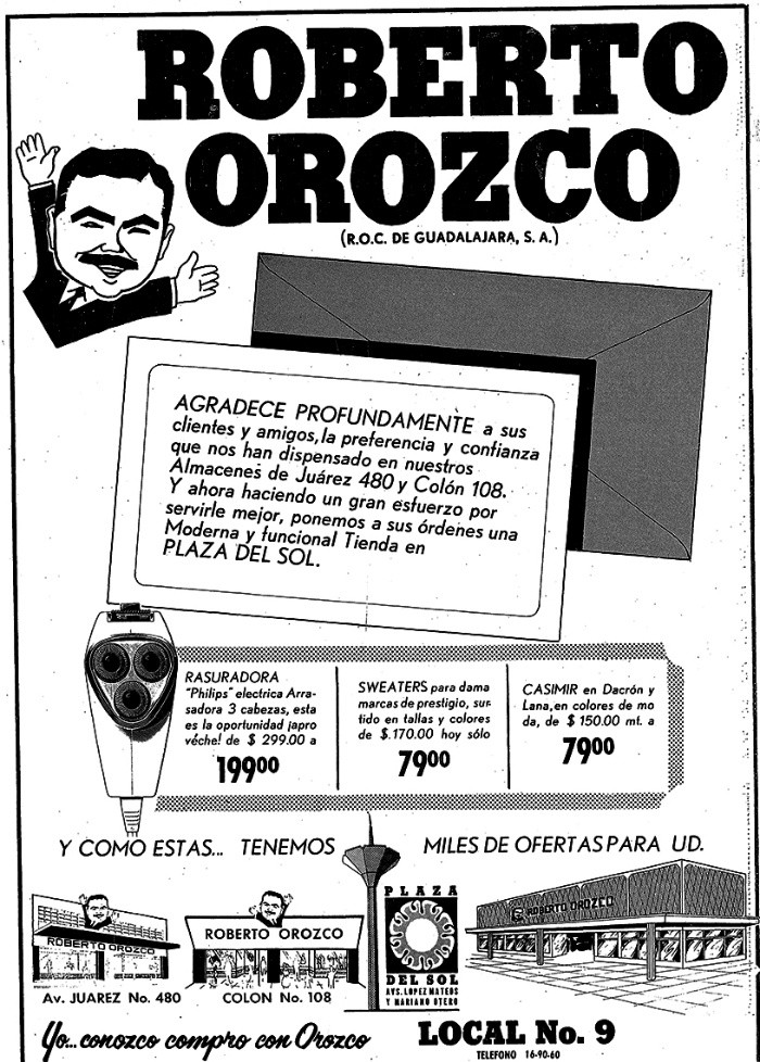 Con la firme convicción de modificar la forma en cómo se desarrollaba el comercio en Guadalajara en la década de los 60, un grupo de hombres visionarios ideó la construcción y operación del primer centro comercial en Jalisco, México y Latinoamérica, el fruto de ese sueño se llama Plaza del Sol.Los empresarios Miguel Moragrega Baquer, Carlos Vachez Defert, Victor Sarquis Sade, Ángel Franco Camberos, Carlos Rabinovitz Fainshtein, Alfonso Chalita Bittar, Alfredo Dau Dau, Ricardo Montaño Beltrán, Roberto Orozco Castellanos, Leopoldo Amutio de Diego, Jaime Varón Modiano y Rene Baruqui Hadad conformaron Centros Comerciales de Guadalajara S.A de C.V., órgano administrativo que daría forma a la construcción de la plaza.“La decisión de esos comerciantes de incursionar en una actividad desconocida no sólo en Guadalajara, sino también en el resto de la República, partía de la premisa de que el crecimiento de la población tapatía y de la zona urbana continuaría en los siguientes años, demandando los miles de consumidores un comercio más moderno, más acorde con las nuevas circunstancias”, explica el investigador Fernando Martínez Réding, en su libro “Plaza del Sol 37 años”.Actualmente, la plaza es un icono social y comercial, su espacio privado se convirtió en público por la apropiación e identidad que los habitantes de Guadalajara y sus visitantes hicieron de sus instalaciones. Cuenta con más de 94 establecimientos dedicados al comercio y servicios para toda la familia, que en un espacio amplio y ameno ofrecen prácticamente todo.Casa Baruqui fue una tienda especializada en ropa, su dueño era René Baruqui. Los primeros negocios de la familia estuvieron ligados a los textiles y la fabricación de pantalones. Se establecieron en la calle Pedro Moreno y 16 de Septiembre, se llamaba La Moderna, después adquirieron la tienda de importaciones “Nuevo Rigal”, las dos tiendas dieron forma a Casa Baruqui.Autodenominado como un supermercado y tienda de descuentos, Maxi ofrecía productos de utilidad para la vida diaria del tapatío. Contaba con sucursales en el Centro y en la Avenida Américas. Actualmente, el espacio donde se ubicaba en la plaza lo utiliza Soriana. Sus fundadores son la familia Moragrega.La vanguardia de la moda internacional, artículos de belleza, perfumería, accesorios para dama y caballeros se encontraba en Fábricas de Francia. Carlos Vachez y Juan Pedro Gandoulf imaginaron un establecimiento que diera realce a la sociedad tapatía. En 2018 se fusionaron con la compañía nacional Liverpool.Surgida de la visión empresarial de Pedro Sarquis, La Cadena se especializaba en la confección de prendas de vestir para el sector popular, contaba con distribución en todo el país. Fueron creadores de la exitosa marca Brittania. En Jalisco llegaron a tener más de 14 sucursales, la de Plaza del Sol era la más grande.Fundada en 1950 por Meyer Rabinovitz, Muebles Bertha inició operaciones en la Avenida Calzada Independencia y Morelos. Se especializaron en muebles para el hogar, además de distribuir las novedades en electrodomésticos. En sus vitrinas se exhibieron los enseres que las familias tapatías utilizaron por más de tres décadas.Los tapatíos podían encontrar en Casa Franco telas, ropa y artículos de mercería. Originalmente se establecieron en el Centro de la ciudad, en Colón y Pedro Moreno. Su fundador fue el señor Ángel Franco González, sus hijos continuaron con su legado comercial. Casa Franco dio paso a Yuvent, comercio que se especializó en ropa para dama.De origen libanés, la familia Dau fundó “La importadora” en el Centro Tapatío. Comercializaba distintos productos para toda la familia. En su aparador principal había una muñeca de gran tamaño, por lo que el público hacía referencia a la tienda por el juguete. Con el paso del tiempo la tienda adoptó el nombre de “La Muñeca”, el cual mantuvo hasta su cierre.Dedicados al comercio por distintas generaciones, la familia Chalita llegó a Guadalajara proveniente del Líbano en el siglo XIX. Se estableció en los portales del Centro, se especializó en la distribución de distintas mercancías nacionales e importadas. En la plaza la tienda era departamental, contaba con muebles, ropa y electrodomésticos.Roberto Orozco Castellanos dedicó toda su vida al comercio, realizó estudios en contaduría pública. Su ramo fue la venta de casimires y ropa para caballero. Su dedicación y orden para los negocios hizo que en poco tiempo tuviera cinco sucursales. Al llegar a Plaza del Sol continúo con el mismo giro, pero le sumó zapatería y otros accesorios.Las Farmacias Levy fueron fundadas por el químico farmacéutico Eduardo Levy y su hermano Agustín, ingeniero químico. Pasaron de ser una botica a un concepto que integraba la venta de medicinas, servicios fotográficos y distribución de otras mercancías de uso común. Establecieron sucursales en el interior del Estado y en la República.Con negocios en distintos sectores, la familia Varón, de origen judío, fue una de las impulsoras del proyecto de Plaza del Sol con su tienda Casa Varón. El ingeniero Jaime Varón junto con su padre Isaac eran socios de Las Novedades, distribuían telas, encajes y mercería, se ubicaban en la calle de Pedro Moreno.Especializados en artículos de ferretería, tlapalería, herramientas y otros insumos industriales y domésticos, Ferreterías Calzada abrió su octava sucursal en Plaza del Sol. Su fundador fue Leopoldo Amutio de Diego, proveniente de una familia española dedicada al comercio. Su primera tienda se ubicaba en Calzada Independencia y Los Ángeles.