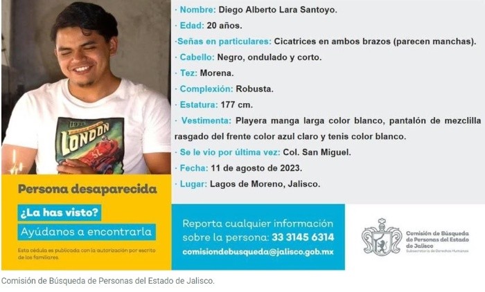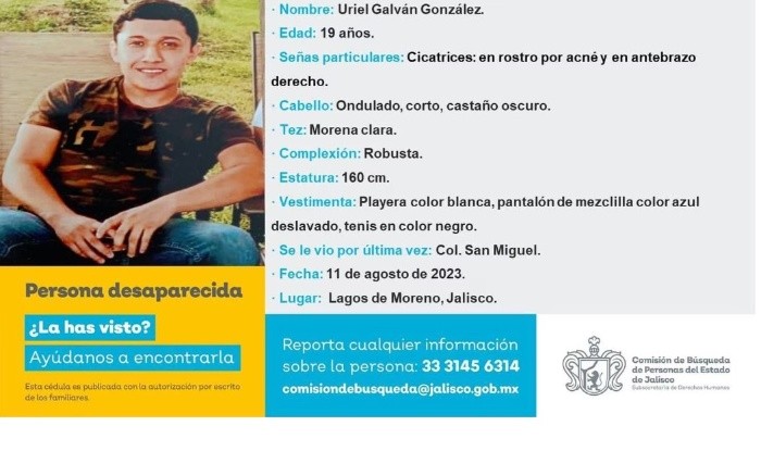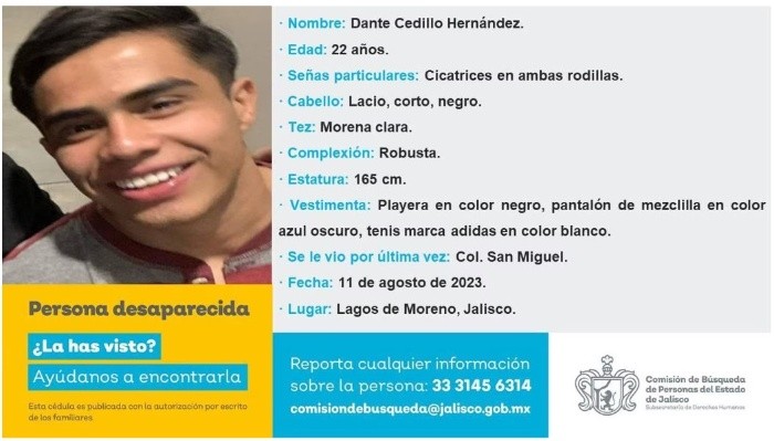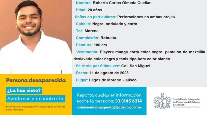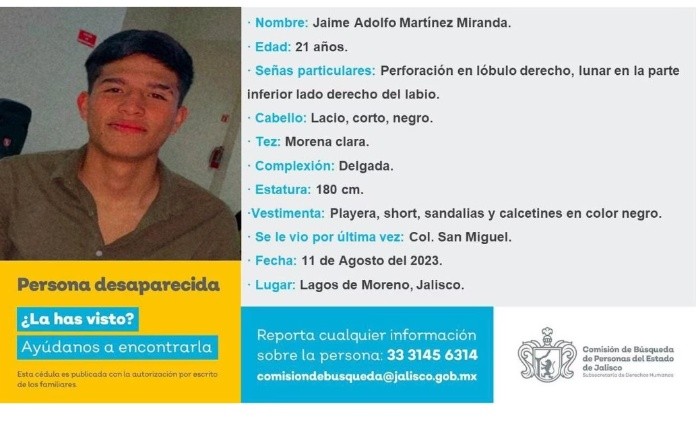 Sigue la búsqueda de los cinco jóvenes desaparecidos desde el pasado 11 de agosto en el municipio de Lagos de Moreno en Jalisco.Los jóvenes desaparecidos son Diego Alberto Lara Santoyo, Roberto Cuéllar, Uriel Galván, Jaime Miranda y Dante Hernández. Sus edades oscilan entre los 20 y 21 años de edad y acudieron a la feria del municipio, pero desde entonces se desconoce su paradero.Según fuentes internas, en los operativos que realiza la Fiscalía del Estado en el municipio de Lagos reportaron que uno de ellos se localizó sin vida, al interior de un vehículo abandonado en la carretera de Lagos de Moreno a Encarnación de Díaz. No se reveló la identidad de la víctima o si hay avances en la localización de los otros cuatro jóvenes.Luis Joaquín Méndez, fiscal de Jalisco, dio a conocer que durante los operativos de búsqueda se localizó un vehículo tipo sedán calcinado perteneciente a una de las víctimas, con un el cuerpo de un hombre al interior de la cajuela, esto, en un acotamiento vehicular hallado en la carretera que va de Encarnación de Díaz a Lagos de Moreno.Según las fichas de búsqueda emitidas por la Comisión de Búsqueda de Personas del Estado de Jalisco estas son las características de los jóvenes.Jaime Adolfo Martínez Miranda, de 21 años es de tez morena clara, cuenta con una perforación en el lóbulo derecho, un lunar en la parte inferior derecha del labio, tiene cabello corto, negro y lacio. Él vestía un short, sandalias y calcetines de color negro.Diego Alberto Lara Santoyo, de 20 años, portaba un pantalón de mezclilla rasgado de color azul claro, una playera blanca de manga larga, y tenis color blanco. Cabello corto, negro y ondulado, de complexión robusta, su tez es morena. Tiene cicatrices en ambos brazos que parecen manchas. Uriel Galván González de 19 años vestía una playera blanca, pantalón de mezclilla azul deslavado y tenis negros cuando desapareció. Su tez es morena clara, su cabello corto y ondulado y cuenta con cicatrices en el antebrazo y en el rostro por acné.Dante Cedillo Hernández, de 22 años de edad portaba una playera negra, pantalón de mezclilla azul oscuro y tenis blancos de la marcar Adidas. Es de complexión robusta y cuenta con cicatrices en ambas rodillas. Su tez es morena clara, su cabello lacio, corto y negro. Roberto Carlos Olmeda Cuéllar de 20 años tiene perforaciones en ambas orejas, su tez es morena, es de complexión robusta y su cabello es negro, ondulado y corto. Vestía una playera negra de manga corta, un pantalón de mezclilla deslavado de color negro y tenis tipo bota de color blanco.Se encontraba estudiando el sexto semestre de la carrera de Ingeniería Industrial en el Centro Universitario de los Lagos (CULagos) de la UdeG.