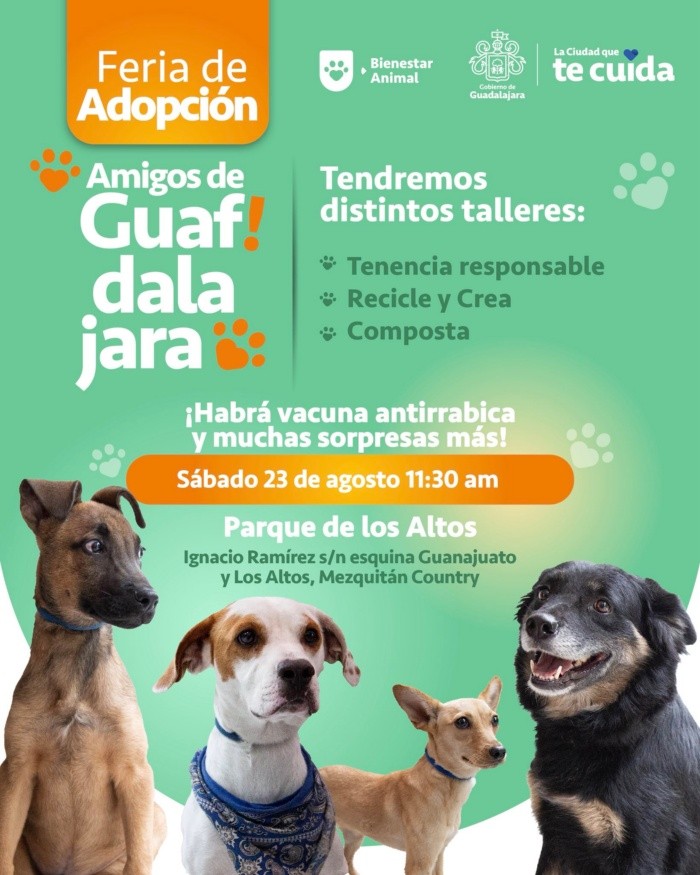 ¿Estás pensando en sumar un miembro peludo a tu familia? La Feria de Adopción en Guadalajara es el lugar indicado, en donde además de encontrar a tu nuevo mejor amigo de cuatro patitas, también habrá talleres, vacunación y muchas sorpresas más.La cita es el próximo sábado 23 de agosto a las 11:30 de la mañana en el Parque de Los Altos, en el municipio de Guadalajara.El Parque de Los Altos se encuentra en Ignacio Ramírez s/n, esquina Guanajuato y Los Altos, Mezquitán Country. Además, en la Feria de Adopción de Guadalajara se realizarán talleres de:De acuerdo con lo anunciado por el Gobierno de Guadalajara, también habrá vacuna antirrábica y muchas sorpresas más. Es tu oportunidad para llevarte a casa un perrito y darle un hogar responsable.NA
