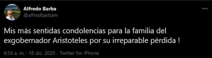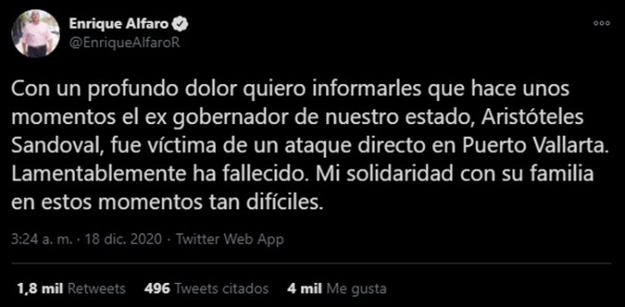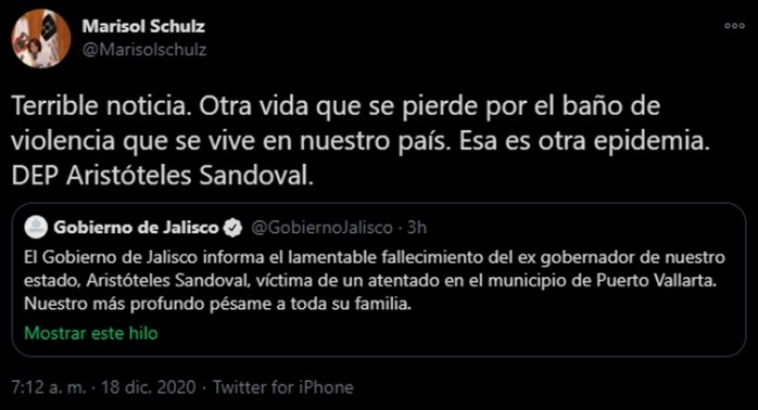 El exgobernador de Jalisco, Aristóteles Sandoval falleció la madrugada de este viernes al ser atacado a tiros en un restaurante en Puerto Vallarta, ante tal hecho varios funcionarios han compartido en redes sociales su sentir.Uno de los principales y de hecho fue quien confirmó la noticia es el gobernador de Jalisco, quien publicó un primer tuit a las 03:24 de la mañana en donde dice: "Con un profundo dolor quiero informarles que hace unos momentos el ex gobernador de nuestro estado, Aristóteles Sandoval, fue víctima de un ataque directo en Puerto Vallarta. Lamentablemente ha fallecido. Mi solidaridad con su familia en estos momentos tan difíciles."Otro fue el alcalde de Guadalajara, Ismael del Toro, quien publicó: "Lamento profundamente el deceso de Jorge Aristóteles Sandoval, ex gobernador de Jalisco y ex alcalde de Guadalajara. Envío un fuerte, sentido y solidario abrazo para toda su familia y amigos. Descanse en paz".De funcionarios que acompañaron a Aristóteles Sandoval en diversos periodos de su gestión como Gobernador de Jalisco está la reacción de Paco Ayón, ex secretario de Educación, y publica "Descansa en paz hermano... Siempre juntos". Se le sumaron otros comentarios como el de Marisol Schulz "Terrible noticia. Otra vida que se pierde por el baño de violencia que se vive en nuestro país. Esa es otra epidemia. DEP Aristóteles Sandoval".Y Alfredo Barba, "Mis más sentidas condolencias para la familia del exgobernador Aristoteles por su irreparable pérdida!"OF