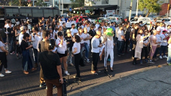 Con la finalidad de exigir la aparición de los tres estudiantes de cine desaparecidos desde el pasado 19 de marzo y de mostrar una unión ante la situación del país, decenas de universitarios y sociedad en general se reunieron está tarde en la Glorieta de las y los Desaparecidos para realizar un performance colectivo.La presentación, ambientada entre pancartas y veladoras, consiguió reunir a diferentes artistas y músicos, quienes en conjunto interpretaron la canción “Give me the power”, como parte de una grabación que será compartida a través de las redes sociales.Al evento asistiero además, familiares en búsqueda de sus desaparecidos, quienes con fotografías y carteles en mano buscaban hacer visible que las manifestaciones no son sólo por los tres jóvenes, si no por las miles de personas que aún continúan sin ser localizadas en el Estado.El performance fue convocado por los comités estudiantiles del CAAV, la Universidad de Guadalajara, ITESO, TEC de Monterrey, Univa, el Centro de Estudios Universitarios, quienes asistieron vestidos en colores de blanco y negro como un mensaje de esperanza y paz.JA