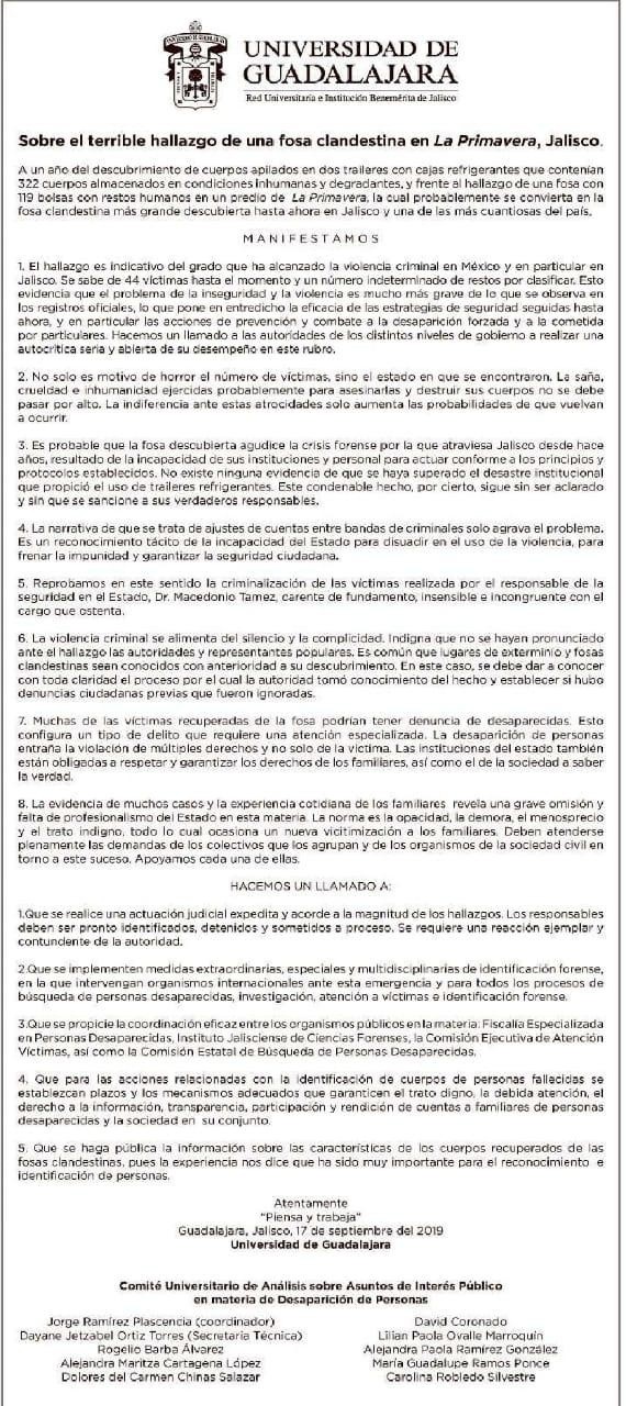 Tras el hallazgo de una fosa clandestina en un pozo de agua en el Poblado de La Primavera en Zapopan, el rector de la Universidad de Guadalajara, Ricardo Villanueva respaldó el comunicado del Comité Universitario de Análisis sobre Asuntos de Interés Público en materia de Desaparición de Personas sobre que hay una crisis forense en el estado. “La única manera para revertir estos problemas tan graves es con muchísima coordinación de todos los niveles de gobierno y de nosotros como universidad”, comentó.El comité, conformado por diez académicos de la Universidad de Guadalajara, cuestionó mediante un comunicado la estrategia del gobierno estatal en materia de seguridad y puntualizó que el hallazgo de las 119 bolsas con partes de cuerpos dentro de la fosa, evidencia que el problema de la inseguridad es más grave en Jalisco y “pone en entredicho la eficacia de las estrategias de seguridad seguidas hasta ahora, y en particular las acciones de prevención y combate a la desaparición forzada y a la cometida por particulares”.Villanueva añadió que la Universidad se suma a la exigencia de “la coordinación de todos los niveles de gobierno para llegar a la verdad, eso es a lo que aspiramos a que haya coordinación y resultados”.Sobre los cuerpos encontrados dentro de las fosas, apuntó que “no podemos nada más pensar que es un tema del crimen organizado y que no debe de haber una explicación o profundidad forense respecto a estos cuerpos”.También remarcó que el tema de los desaparecidos en Jalisco debe de ser una prioridad para las autoridades, “que se actúe como si fuera un familiar de ellos, esa es la sensibilidad que hace falta de las autoridades”.La semana pasada, el titular de la Coordinación General Estratégica de Seguridad, Macedonio Tamez , señaló que en muchos de los casos las víctimas de las fosas clandestinas “tienen antecedentes penales”.Ante esto, el rector de la universidad dijo que se debe “evitar tener ese simplismo, que la única respuesta es ‘que es entre ellos’, cuando se dan estos casos se le quiere dar tranquilidad a la población diciendo eso; pero no es entre ellos. Son muchísimas familias que están viviendo la tragedia de una desaparición, de la inseguridad, es un tema de todos y hay que llegar al fondo y dar respuestas que den certeza”.NM