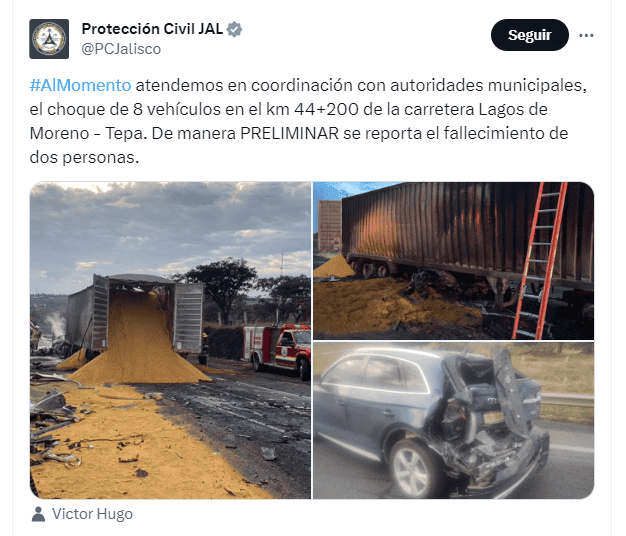 Esta tarde del 5 de diciembre de 2023, se ha registrado un accidente múltiple en la Carretera Guadalajara-Colima. En el kilómetro 3+500 distintos vehículos de carga se impactaron, provocando volcaduras de algunos. Al momento no se sabe sobre el saldo del incidente.Autopistas Guadalajara-Colima dio a conocer que al momento el sentido Guadalajara se encuentra cerrado en su totalidad, mientras que el sentido Colima, se encuentra cerrado el carril de alta velocidad. Por otro lado, también se registró un accidente en la carretera Guadalajara- Lagos de Moreno. En redes sociales circulan videos donde se aprecia el accidente del choque múltiple. En el kilómetro 44+200 de la vía de Lagos de Moreno a Tepatitlán, según informó Protección Civil Jalisco ha dejado, al menos dos fallecidos.El accidente se dio cerca de la caseta de cobro de la vialidad de cuota que lleva desde Guadalajara a diferentes municipios de Los Altos de Jalisco, entre ellos Tepatitlán.El percance, al parecer fue una carambola en la que se vieron involucrados varios vehículos incendiados. El accidente ocurrió la tarde de este martes en el Centro Universitario de los Altos (Cualtos) de la Universidad de Guadalajara, donde varios autos esperaban avanzar sobre la carretera, pues más adelante había un choque.Momentos más tarde, se acercó el tráiler cargado con semillas y tras una supuesta falla en los frenos, se impactó con por varios automóviles quedando uno debajo del camión. La directora de bomberos y protección civil de Tepatitlán confirmó que de esto resultaron 5 persona heridas, pero que sólo una fue trasladada en ambulancia particular proporcionada por el seguro de la autopista al hospital. Además se informó que el accidente dejó saldo de dos personas fallecidas.