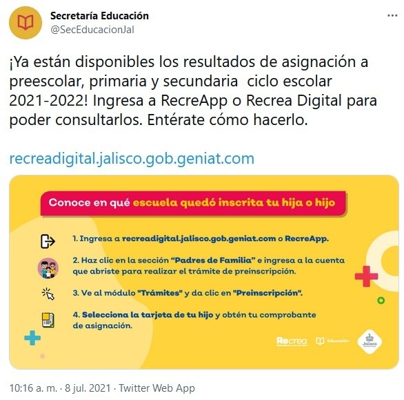 Si inscribiste a tus hijos para el ciclo escolar 2021-2022 en Jalisco, ya puedes checar las escuelas asignadas para preescolar, primaria y secundaria.La Secretaría de Educación Jalisco (SEJ) informó hoy que se pueden consultar las escuelas donde quedaron inscritos los estudiantes, a través de la plataforma Recrea Digital o la aplicación RecreApp.Juan Carlos Flores Miramontes, titular de la SEJ, detalló los procesos para consulta o para preinscribirse, previo al regreso a claes.Si ya se realizó el trámite de preinscripción, es posible pedir un cambio de escuela, a partir del 14 de julio podrá realizarse de la plataforma o aplicación señaladas.Y a partir del 16 de agosto podrán ir físicamente a la escuela donde se pidió el cambio para hacer el proceso.IM