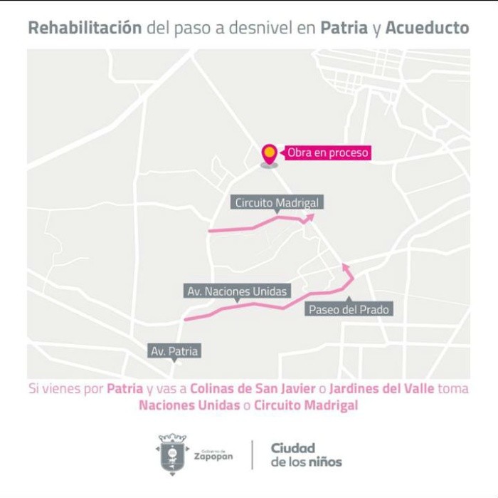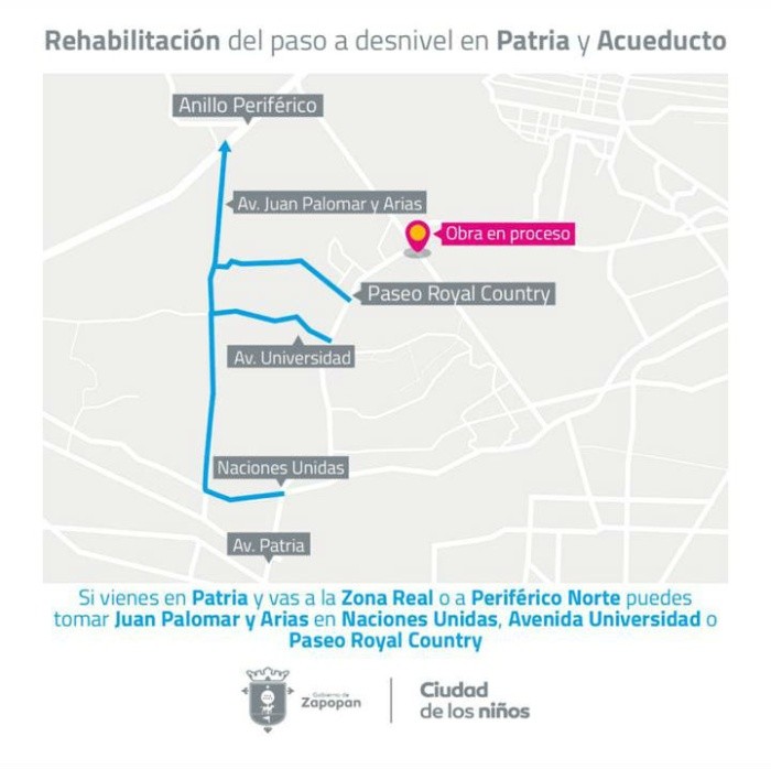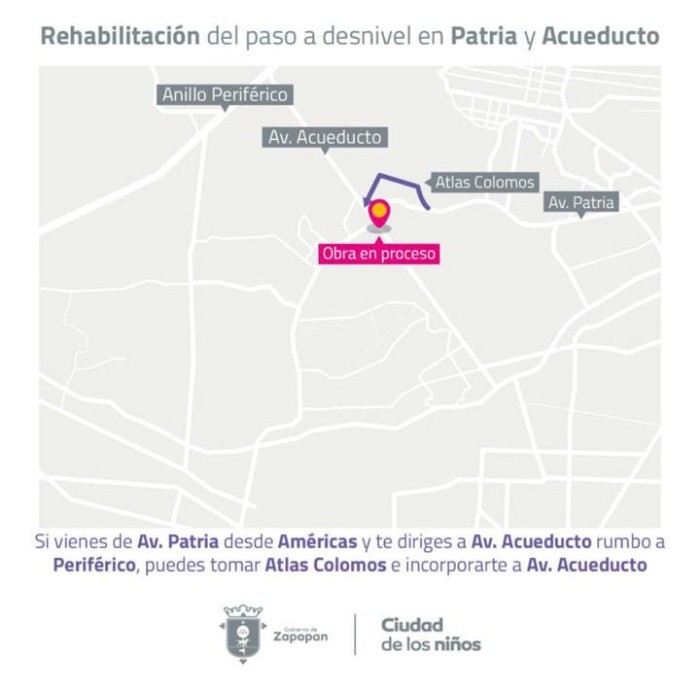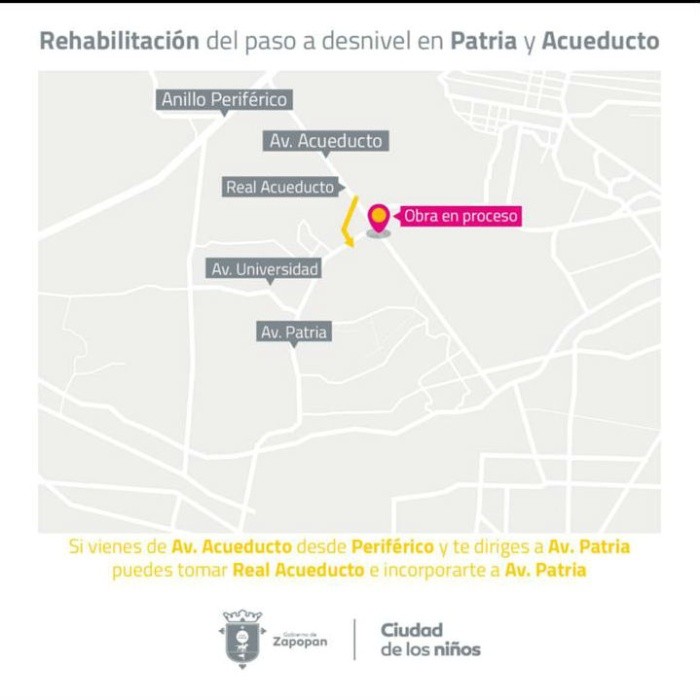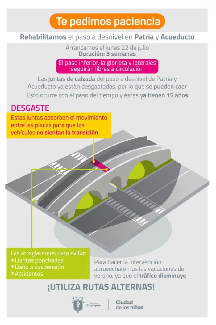 A partir de este lunes 22 de julio, estará cerrado el paso a desnivel de las avenidas Patria y Acueducto, en el municipio de Zapopan, durante tres semanas, debido a obras de rehabilitación.El Ayuntamiento de Zapopan anunció la rehabilitación del paso a desnivel debido al desgaste de las juntas de calzada, las cuales ya tienen quince años de uso. Este desgaste puede provocar llantas ponchadas, daños a la suspensión de los vehículos y otros accidentes.Los trabajos se realizarán aprovechando las vacaciones de verano, cuando existe una disminución del tráfico, y la rehabilitación del paso a desnivel impedirán que las juntas de calzada se caigan por el paso del tiempo y el desgaste.Aunque el paso inferior de Avenida Patria, las laterales de ambas vías y la glorieta seguirán abiertos a la circulación en este importante cruce de la ciudad, el gobierno de Zapopan propone rutas alternas para aliviar el tráfico que se hará en esta zona durante las obras.- Para los que viajan de Patria hacia Colinas de San Javier, se propone utilizar la avenida Naciones Unidas y Circuito Madrigal como vías alternas.- Para quienes vienen de Patria desde Avenida Américas y se dirigen a Avenida Acueducto rumbo a Periférico, se sugiere tomar Atlas Colomos para incorporarse a Acueducto.- Para los que van de Acueducto a Patria, la incorporación se haría a través de Real Acueducto.- Los automovilistas que se dirigen de Avenida Patria a la Zona Real o Periférico Norte tienen como alternativa tomar la avenida Juan Palomar y Arias en Naciones Unidas, Avenida Universidad o Paseo Royal Country.NM