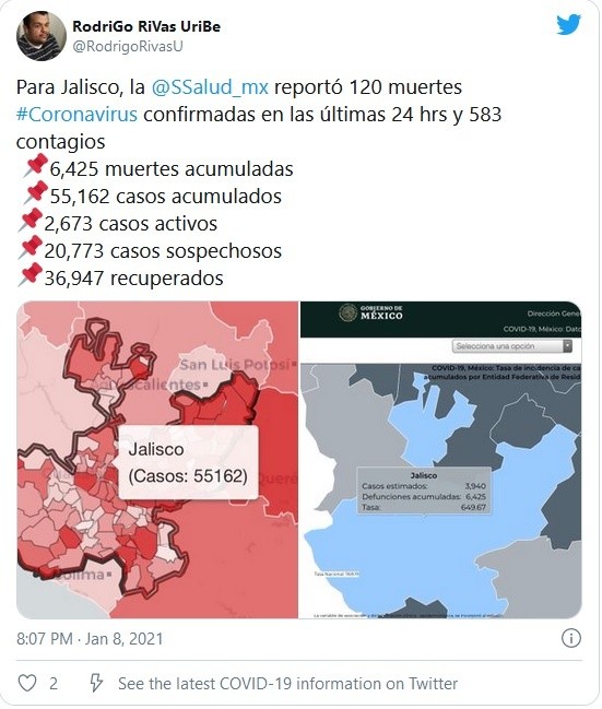 Este viernes fue notificada la mayor cantidad de muertes por COVID-19 en Jalisco, con 120 nuevos decesos, con lo que las víctimas del virus ascendieron a seis mil 425 desde que fue reportada la primera, el 23 de marzo de 2020, informó la Secretaría de Salud Jalisco. Además, la cantidad de nuevos contagios rompió el récord que se reportó el pasado 21 de diciembre, cuando mil 200 personas se sumaron a la estadística, pues este viernes fueron mil 283 casos positivos más, con los que la cantidad de infectados por el virus ascendió a 152 mil 793.En el caso de los fallecimientos, la dependencia argumentó que la cifra obedece a un rezago en la notificación de las muertes, sobre todo del Instituto Mexicano del Seguro Social (IMSS). “Este viernes 8 de enero serán notificadas 120 muertes asociadas a COVID-19 en Jalisco, de las cuales, únicamente 72 corresponden a la semana actual (semana 1 de 2021) y el resto, es decir, 48 decesos, corresponden al periodo comprendido entre las semanas epidemiológicas 50 a 53 de 2020”. No obstante, esto significa que aún con el rezago, la cifra de muertes sigue siendo la más alta hasta el momento, pues el récord era de 70 decesos reportados el miércoles pasado. Incluso, el promedio de muertes durante la primera semana de 2021 ha sido el más alto en lo que va de la pandemia, al registrar del 2 al 8 de enero 419 fallecimientos, lo que da 59.9 decesos por día.La semana previa, del 26 de diciembre al viernes 1 de enero, las víctimas sumaron 292, 41.7 muertes diarias, lo que significa que en los últimos siete días se incrementaron las muertes en un 23%, tras nueve días después de los festejos del 24 de diciembre.A la fecha, hay casos activos en 99 municipios de Jalisco y se han reportado infecciones en mil 419 trabajadores de la salud cuyo contagio está asociado a su labor en las unidades médicas.JM