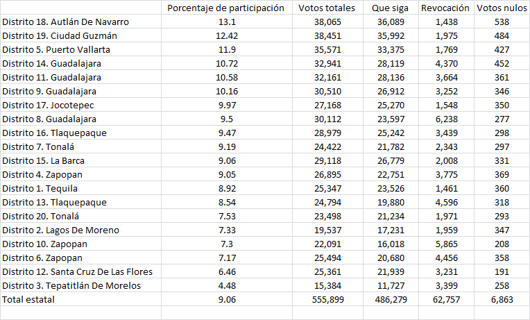 Con el voto de apenas 9.06% de los ciudadanos inscritos en el listado nominal, Jalisco fue el Estado del país con el menor porcentaje de participación en la consulta popular sobre revocación de mandato, que impulsó el Presidente Andrés Manuel López Obrador (AMLO).Tras concluir el cómputo total en los consejos distritales, la Junta local del Instituto Nacional Electoral (INE) informó que en la entidad votaron 555 mil 899 personas, es el noveno lugar nacional en número de votos.La lista nominal estatal la conforman 6 millones 134 mil 265 personas que cuentan con credencial de elector.En el desglose de los veinte distritos federales, destacan los casos del distrito 18 con cabecera en Autlán de Navarro y el 19 de Ciudad Guzmán que registraron el mayor nivel de participación con 13.1 y 12.42%, respectivamente.El menor porcentaje se presentó en el distrito 3 con cabecera en Tepatitlán donde apenas votaron el 4.48% del listado nominal.El mayor apoyo a que el presidente concluya su sexenio se presentó en el distrito 18, ahí se contaron 36 mil 89 votos a favor. En la contraparte el distrito ocho de Guadalajara fue donde más personas se pronunciaron por la revocación con seis mil 238 votos.En total, a nivel estatal, 486 mil 279 personas apoyaron la continuidad del presidente; en 2018 un millón 461 mil 348 jaliscienses votaron a favor de la llegada a la presidencia de López Obrador. En el ejercicio de consulta se instalaron sólo 36% de las casillas de votación habilitadas en la elección presidencial.Las Entidades del país donde hubo mayor participación fueron el Estado de México, Veracruz, Ciudad de México y Chiapas; que superaron el millón de votos.MF