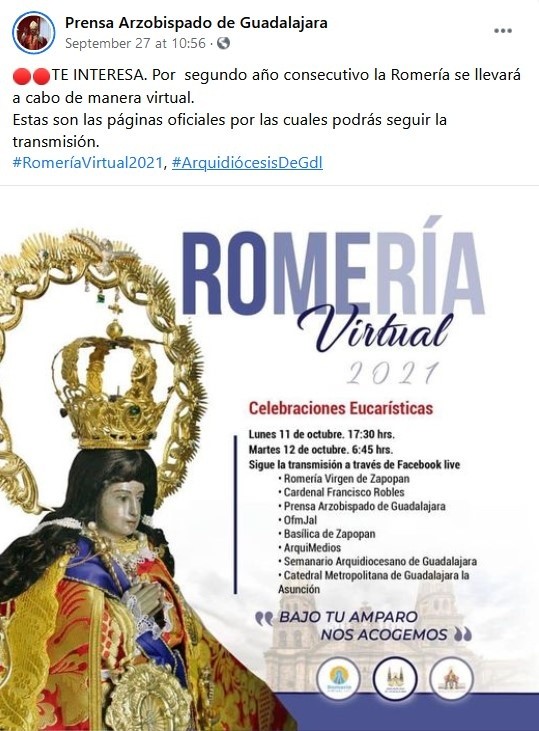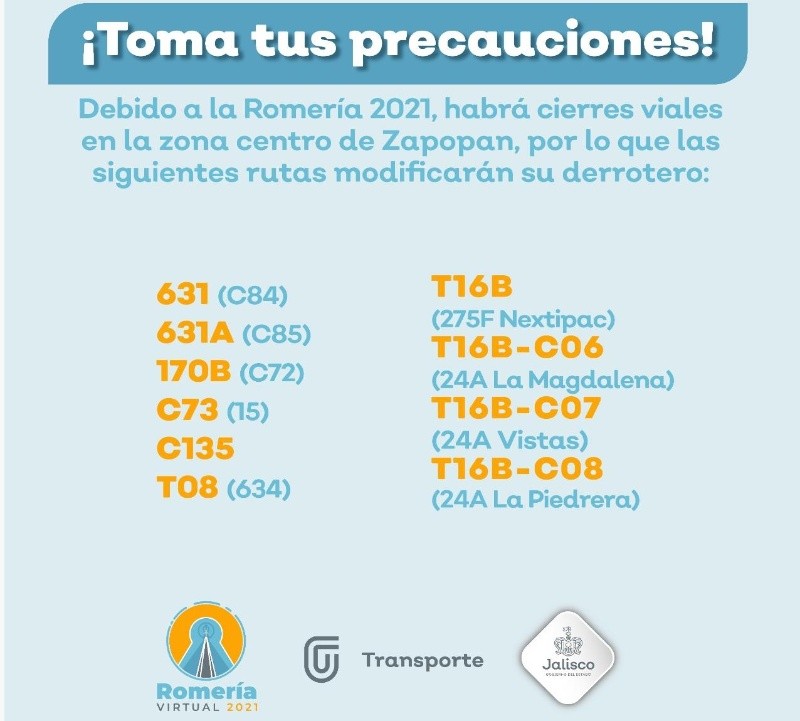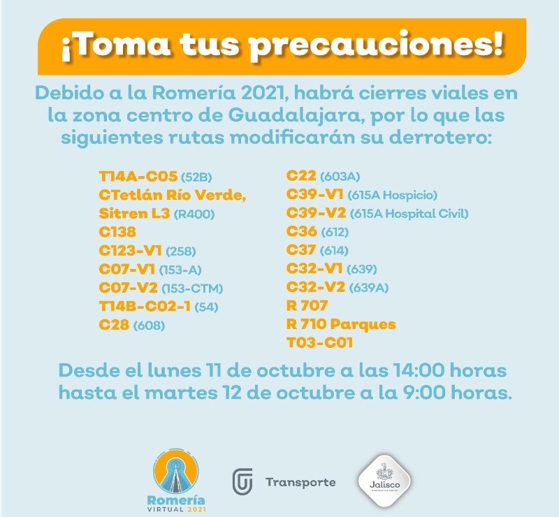 La Romería 2021 de la Virgen de Zapopan será virtual, al igual que la edición del año pasado, por lo que la tradicional celebración del 12 de octubre en la Zona Metropolitana de Guadalajara será sin público. Debido a las medidas sanitarias por la pandemia de COVID-19 en Jalisco, los eventos masivos continúan restringidos durante todo octubre. Pero las celebraciones de "La Generala" podrán seguirse a través de transmisiones en vivo.Autoridades municipales y el Arzobispado de Guadalajara informaron el sobre el operativo y actividades por la 287 edición de la Romería , así como horarios de las misas y cómo verlas. Para esta edición no se han convocado contingentes, ni a danzantes para acompañar a la imagen de la Virgen, que se trasladará en un vehículo. El presidente municipal de Guadalajara, Pablo Lemus Navarro, dijo que los detalles del recorrido de la Romería no se dará a conocer para tratar de evitar la aglomeración de personas.Guadalajara: Se implementarán en calles del Centro Histórico desde el lunes 11 de octubre a las 12:00 horas al martes 12 de octubre a las 10:00 horas. El polígono está conformado por las siguientes calles: Zapopan: Aplicarán cierres viales del 11 de octubre, a las 20:00 horas, al 13 de octubre a las 23:00 horas en las siguientes vialidades: Estos cierres no representan afectaciones en la operación de las tres líneas del Tren Ligero.Guadalajara: Se modificarán derroteros de rutas del transporte público, del 11 de octubre a las 14:00 horas hasta el 12 de octubre a las 9:00 horas. Zapopan Centro: Habrá desvíos a partir del 11 de octubre a las 17:00 horas hasta el 14 de octubre a las 16:00 horas.Se aplicará ley seca desde las 7:00 PM del lunes 11 y hasta las 11:59 PM del martes 12 de octubre. Consistirá en la restricción en la venta de bebidas alcohólicas para llevar, en los restaurantes se podrán vender bebidas para acompañar el consumo de alimentos, siempre y cuando cumplan con las medidas sanitarias.Sábado 9 de octubre: Domingo 10 de octubre:Misas ordinarias en la Catedral tapatía.Lunes 11 de octubre:Martes 12 de octubre:Miércoles 13 de octubre:La fecha marca el final del ciclo del ritual conocido como "La Llevada de la Virgen", que comenzó en el año 1734 y consiste en el traslado de la imagen de "La Generala" a varios templos y otros lugares, como hospitales, fábricas y escuelas de la ZMG. Esa serie de visitas comienza en mayo y concluye 12 de octubre con el recorrido desde la Catedral tapatía para llevar a la Virgen de regreso a su Basílica, en Zapopan.La festividad se caracteriza porque en el recorrido acompañan a la imagen miles de personas, entre danzantes, la Guardia de Honor, charros, grupos musicales y fieles de parroquias de la ZMG. Además, en las más recientes ediciones previas a la pandemia, llegó a congregar a más de 2 millones de peregrinos. En noviembre de 2018, la Romería de Zapopan fue declarada Patrimonio Cultural Inmaterial de la Humanidad de la Unesco.IM