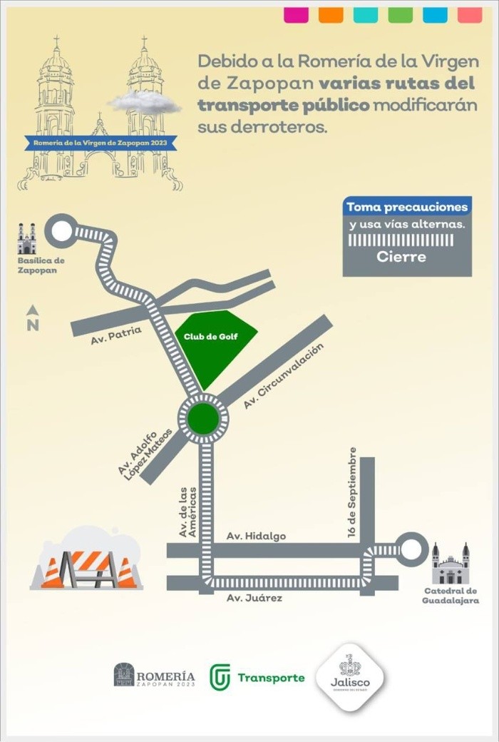 Con motivo de la Romería de la Virgen de Zapopan, las rutas C135, C73, C84, C85, C72, T16B, T16B-C06 La Magdalena, T16B-C07 Vistas, T16B-C08 La Piedrera, T08 y T09, que cruzan el centro de Zapopan y que circulan por las avenidas Vallarta, Unión y Américas en Guadalajara, modificarán sus derroteros mientras pasa el contingente de peregrinos, informó este martes la Secretaría de Transporte (Setran).Indicó, la modificación de derroteros iniciará a temprana hora del día 11 de octubre, principalmente en el caso de las rutas que ofrecen servicio en el municipio de Guadalajara, y en Zapopan a partir de las 18:00 horas, es decir, a las seis de la tarde. La ruta C73, de la calle Sarcófago se desviará hacia la calle Libertad para luego tomar su recorrido ordinario por Av. Tesistán, mientras que en sentido inverso, de Av. Tesistán se desviará hacia la calle Independencia y en Industria continuará su recorrido.La ruta 170B se desviará de la Av. Tesistán hacia la calle Independencia, luego Industria, Manuel H. Alatorre y en Av. Aurelio Ortega continúa su derrotero ordinario. En su viaje de regreso, luego de circular por Av. Aurelio Ortega, Manuel H. Alatorre y Sarcófago se desviará hacia la calle Libertad para continuar por Av. Tesistán.Por su parte la ruta C84, de Fray Toribio de Motolinía se desviará hacia la calle Ramón Corona y en la calle Zaragoza se retornará para continuar por Av. Hidalgo y continuar su recorrido diario. La ruta C85 dos vías, de Fray Toribio de Motolinía se desviará hacia Ramón Corona, Cuitláhuac, Independencia, Industria y en la Lateral Av. Juan Pablo II retomará su recorrido.En su trayecto de regreso, de circular por Av. Manuel Ávila Camacho se desviará hacia la Av. Aurelio Ortega, Manuel H. Alatorre, Sarcófago, Libertad, Emilio Carranza, Allende, 16 de Septiembre y en Constitución continuará su recorrido habitual. En lo que corresponde a las rutas C135, T08 y T09, de Av. Tesistán se desviarán hacia la calle Independencia, Industria y en la lateral de Av. Juan Pablo II continúa su recorrido, mientras que al regresar, de la lateral de Av. Juan Pablo II se desviarán hacia Av. Manuel Ávila Camacho, Santa Rita, Av. Aurelio Ortega, Manuel H. Alatorre, Sarcófago, Libertad y en Av. Tesistán se reincorporan a su derrotero.La ruta T16B, de la lateral de Av. Juan Pablo II se desviarán hacia la Av. Manuel Ávila Camacho y en Santa Rita se retornan para continuar por Av. Aurelio Ortega y proseguir su recorrido en la lateral de Av. Juan Pablo II. Por último, las rutas T16B-C06 La Magdalena, T16B-C07 Vistas y T16B-C08 La Piedrera, de Av. Tesistán se desviarán hacia la calle Independencia y en la calle Zaragoza se retornarán para continuar por la Av. Hidalgo su derrotero habitual.Las rutas señaladas regresarán a su derrotero habitual una vez terminado el paso de la Romería, previendo que esto vaya ocurriendo paulatinamente después de las 14:00 horas. FS