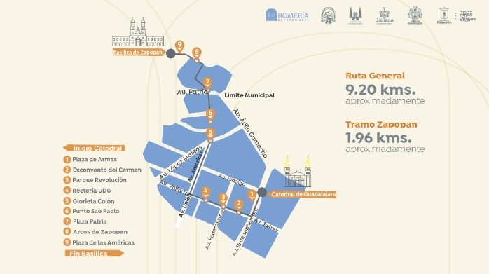 El próximo sábado 12 de octubre se llevará a cabo la celebración de la Romería de la Virgen de Zapopan, en su regreso a la Basílica luego de haber peregrinado por distintos templos de la ciudad.Así, la virgen de Guadalajara saldrá, alrededor de las 6:00 horas y luego de su misa de despedida, de la Catedral Metropolitana de Guadalajara, partiendo con rumbo a Zapopan.Desde que se iniciaron las obras para la construcción de la Línea 3 del Tren Ligero, la Romería zapopana cambió su ruta, modificando el paso que tenía sobre la avenida Alcalde hacia Ávila Camacho.Así entonces, este 2024 se mantiene la ruta en la cual, tras concluir su misa de despedida, saliendo de la Catedral se dirigirá hacia la avenida Juárez, por donde caminará en contingente hasta llegar a la avenida Américas.De ahí se dirigirá por toda esta vía hasta llegar a la avenida Juan Pablo Segundo, para ingresar por los Arcos de Zapopan al andador 20 de noviembre, donde será recibida por los hermanos franciscanos para acompañarla hasta el atrio de la Basílica de Zapopan, a donde se prevé, llegue hacia las 11:00 horas, y dar paso a la misa de recepción que será ofrecida por el Cardenal de Guadalajara, Francisco Robles Ortega.La Romería de Guadalajara llegará este 2024 a su edición número 290, desde que en 1734, sus fieles instaron a las autoridades eclesiásticas para sacar a “La Generala” de la Basílica Zapopana para llevarla a las comunidades, y así poder solicitarle favores y milagros.Desde 2018 la Romería fue declarada como Patrimonio Cultural Inmaterial de la Humanidad, reconociendo que es una de las tradiciones populares más fuertemente arraigadas en el occidente de México. MF