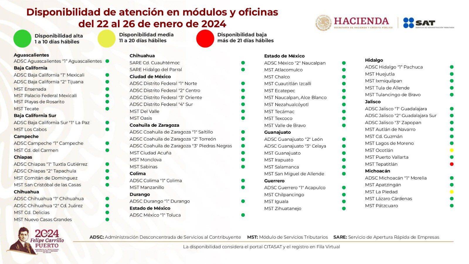 El Servicio de Admimistración Tributaria (SAT), dio a conocer a través de su cuenta oficial de X, el listado de disponibilidad de citas para atención presencial en los módulos y oficinas desconcentradas en las 32 entidades del país. La disponibilidad corresponde a la semana del 22 al 26 de enero:Aquí te compartimos la lista de los módulos y la disponibilidad de las diferentes entidades, incluyendo Jalisco:El SAT recuerda a los usuarios que los trámites son gratuitos y que garantiza tu cita a través de la fila virtual.Las personas de la tercera edad, con discapacidad y mujeres embarazadas o con menores lactantes, no requieren cita para la atención de sus trámites.Únicamente la inscripción al RFC y la generación de firma electrónica, requieren atención presencial, señala el SAT.*Mantente al día con las noticias, únete a nuestro canal de WhatsApp aquí: https://whatsapp.com/channel/0029VaAf9Pu9hXF1EJ561i03MV