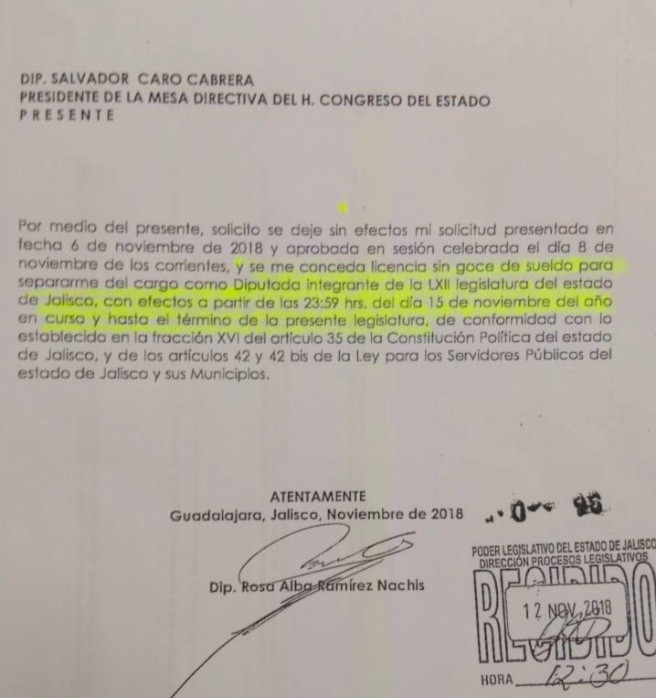 Tras renunciar a la Dirección del Servicio Nacional de Empleo en Jalisco, Rosa Alba Ramírez Nachis, formalizó su intención de reincorporarse como diputada al Congreso estatal. Ramírez Nachis fue legisladora local del seis al 15 de noviembre pasado, cuando llegó a ocupar el espacio que quedó vacante desde el arranque de la 62 Legislatura; luego de que Patricia Martínez (primer lugar de la lista de plurinominales) solicitó licencia para irse a ocupar la Coordinación General Estratégica de Gestión del Territorio de Gobierno del Estado. La reincorporación podría terminar de definirse en el Tribunal Electoral pues en la solicitud de licencia que se notificó al pleno del Congreso se especificó que la ausencia de Ramírez Nachis sería hasta el término de la Legislatura. Actualmente la curul en disputa es ocupada por Ana Lidia Sandoval, novena en la lista de pluris emecistas.El coordinador de la fracción de Movimiento Ciudadano, Salvador Caro Cabrera, dijo desconocer la presentación del oficio en el que la legisladora con licencia solicitó reincorporarse.LS
