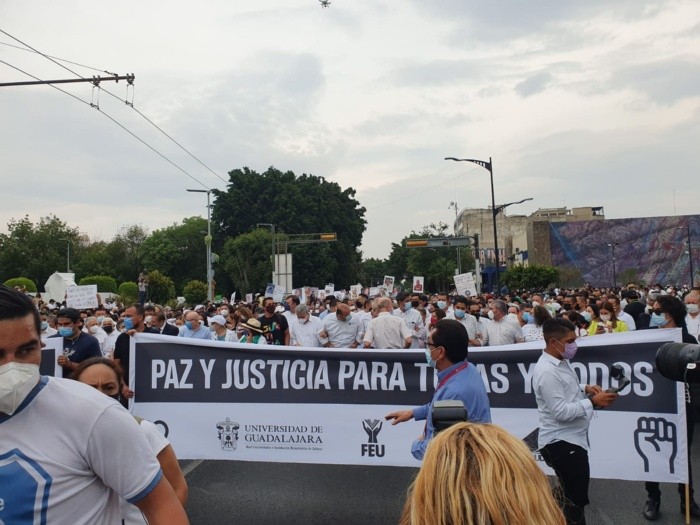 Al grito de "Ni uno más", comenzó la manifestación por el asesinato de los hermanos González Moreno convocada por la Universidad de Guadalajara y la Federación de Estudiantes Universitarios.La marcha, a la que asistieron miles, estuvo encabeza el rector general Ricardo Villanueva Lomelí, así como los líderes del sindicato de la UdeG, el presidente de la FEU, Fundej, Javier Armenta y profesores.Los manifestantes caminaron por Av Vallarta hacia Chapultepec hasta la Glorieta de las y los desaparecidos, donde llegaron aproximadamente media hora después.En el monumento, José de Jesús Becerra secretario general del SUTUdeG señaló que los hermanos "no estaban en la calle, ni en una carretera, ni en un auto: los sacaron de sus casas".Añadió que "exigimos que se pongan a trabajar, garantice nos libertad esperanza, poder salir a las calles sin el miedo de no regresar".Javier Armenta resaltó que el Estado "debería ser el primero en la Glorieta de los Desaparecidos", mientras un grupo de manifestantes gritaba "fuera Alfaro" y "no es campaña"."Hoy Jalisco es reconocido como un estado desbordado de violencia. Que un estado prive de su libertad a los jóvenes, es un estado de alarma".Luego de ello, el presidente convocó a un pase de lista de los estudiantes de la Universidad que han sido desaparecidos así como un minuto de silencio por todas las víctimas. Al día, Jalisco suma 12 mil 628 desaparecidos.Por su parte, el rector general de la UdeG, señaló que la marcha esporádica es por 16 estudiantes desaparecidos pero también por los miles de estudiantes."La barbarie se ha apoderado de nuestra existencia. Urge que la política ponga en el centro la buena vida. Caminamos aquí para decir "basta" como acto simbólico para manifestar que no podemos rendirnos ante esta catástrofe. Exigimos justicia para todos los ausentes y paz para todos los presentes".Guadalupe Aguilar, vocera de Familias Unidas por Nuestros Desaparecidos en Jalisco compartió que tiene 10 años buscando a su hijo."Estoy aquí para que ninguna otra madre tenga que buscar a su hijo o hija. Semefo es una fosa, Jalisco es una fosa. El día que todas las madres de desaparecido nos unamos ¡no se la van a acabar!", dijo.Añadió que se tienen que tomar medidas radicales para asegurar que no habrá ni uno más e invitó a todos los colectivos de desaparecidos a unirse en uno solo para luchar en un solo frente.Con el encendido de veladoras en la Glorieta de los Desaparecidos terminó la manifestación convocada por la Universidad de Guadalajara para exigir Paz y Justicia para los hermanos González Moreno.LS