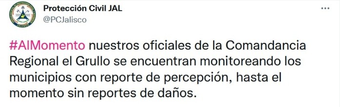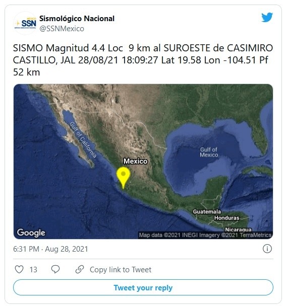 La tarde de este sábado, un temblor de magnitud 4.4 se registró en Casimiro Castillo, Jalisco. Hasta el momento, no se reportan mayores afectaciones o personas lesionadas por este fenómeno.De acuerdo con el Servicio Sismológico Nacional, el sismo tuvo lugar nueve kilómetros al suroeste del municipio costero: "SISMO Magnitud 4.4 Loc 9 km al SUROESTE de CASIMIRO CASTILLO, JAL 28/08/21 18:09:27 Lat 19.58 Lon -104.51 Pf 52 km", se lee en la cuenta de Twitter de la dependencia.En redes sociales, se leen reportes de usuarios que percibieron el movimiento telúrico de forma leve. Corporaciones de Protección Civil realizan trabajos preventivos para descartar daños. "Nuestros oficiales de la Comandancia Regional el Grullo se encuentran monitoreando los municipios con reporte de percepción, hasta el momento sin reportes de daños", informan en Twitter.Si te interesó esta noticia y quieres saber más, entonces descarga y descubre INFORMAPlus, la aplicación digital de EL INFORMADOR, en donde tenemos contenidos exclusivos, seleccionados por nuestros editores, para darles una experiencia más completa a los lectores. Si eres suscriptor de EL INFORMADOR tu acceso está incluido, solicítalo al 33 3678-7777Descarga la aplicación y pruébala GRATIS por treinta días.Para iOS: https://apple.co/35jaVgbPara Android: https://bit.ly/3gwVSEVJM