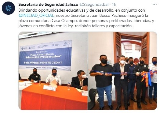 La Secretaría de Seguridad abrió la tercera sala virtual y plaza comunitaria, Casa Ocampo, para las personas preliberadas y liberadas, y jóvenes en conflicto de la ley en Jalisco con oferta educativa, capacitación para el trabajo, talleres especializados y terapias cognitivas conductuales.El director de Prevención y Reinserción Social, José Antonio Pérez Juárez, aseguró que la reinserción social no termina con la pre liberación o liberación de las personas sino que se supervisan las medidas cautelares y se acompaña en ejes como la educación, salud, deporte, capacitación productiva y trabajo.Se busca la corresponsabilidad institucional y la solidaridad de la sociedad civil a favor de la reinserción social para la reducción de delitos, la casi nula reincidencia y la formación de las personas para su integración.Casa Ocampo se ubica en el municipio de Guadalajara, la cual fue inaugurada por los titulares de la Secretaría de Seguridad Pública,de la Dirección de Prevención y Reinserción Social del Estado de Jalisco, la Comisaría de Atención a Preliberados y Liberados, el Instituto Estatal para la Educación de Jóvenes y Adultos, y la asociación civil Mentte CEDAT.NR
